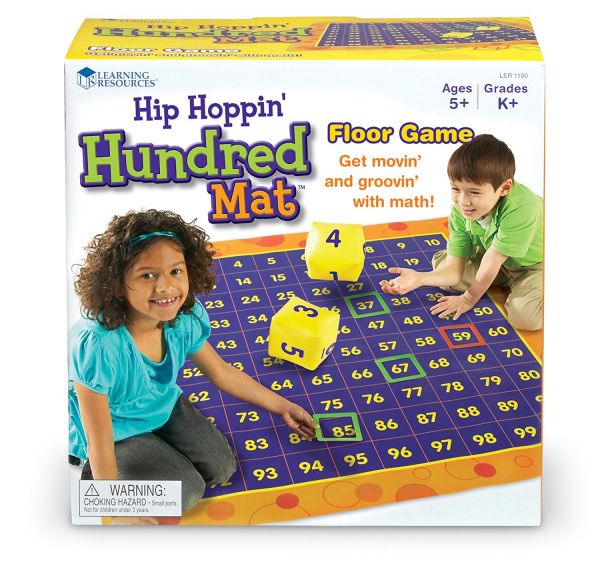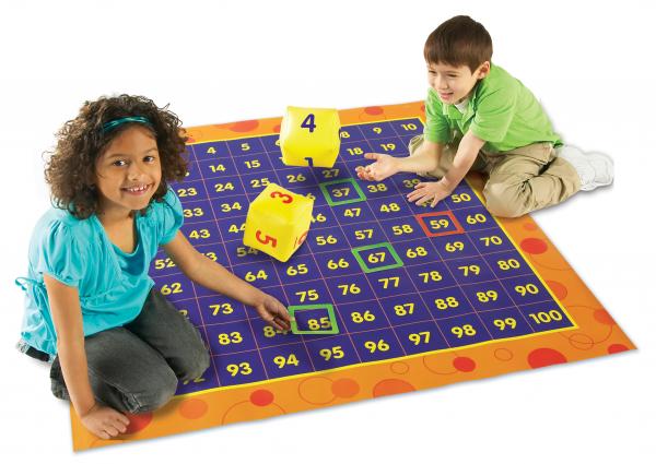A Learning Resources matematikai szőnyegén a számok 1-től 100-ig találhatóak. A 120x120 cm méretű szőnyegen egy narancssárga, kör alakú mintával ellátott kereten belül a számok sötétkék alapon citromsárgával vannak írva. A sötétkék alap kis négyzetekre van felosztva, minden négyzetben 1-1 szám található. A készletben a szőnyegen kívül található: 2 db felfújható, citromsárga dobókocka 1-6-ig lila színnel számozva és 7-7 db zöld és narancssárga jelölő keret. A kockák élei teljesen lekerekítettek, anyaguk puha műanyag. A csomagolás mérete: 27x27x16 cm