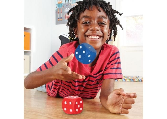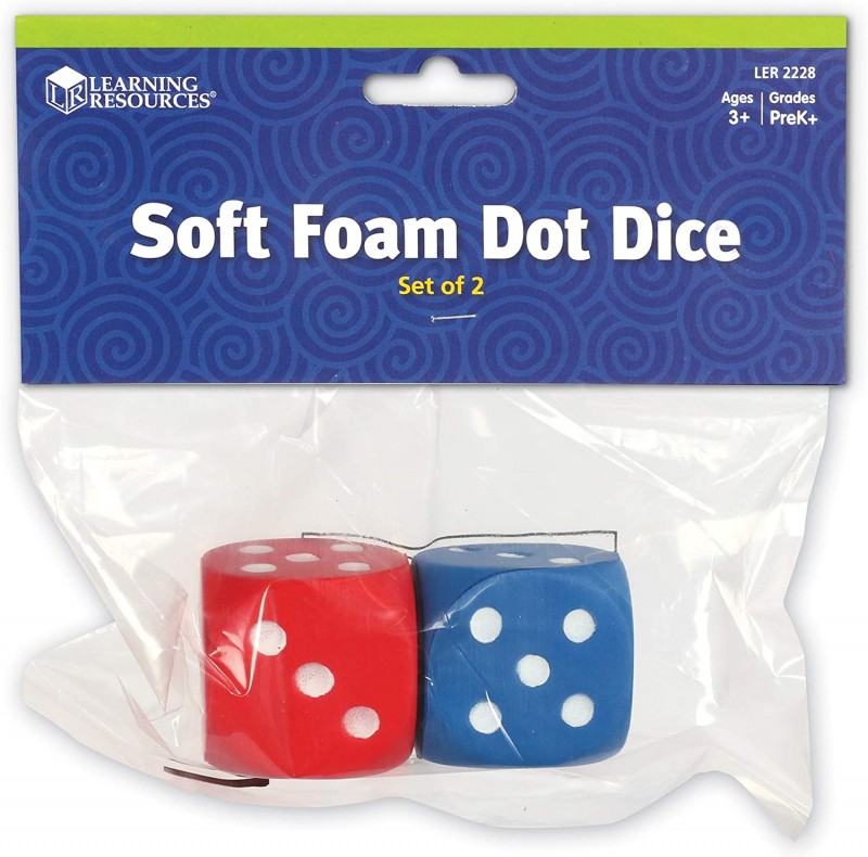 A Learning Resources 2 darabos színes dobókocka szettjében az egyik kocka piros színű, a másik pedig kék. A kockák mérete 5x5 cm. A számokat fehér színű pöttyök jelölik, akárcsak a hagyományos dobókockáknál. A csomagolás mérete: 18x8x5 cm