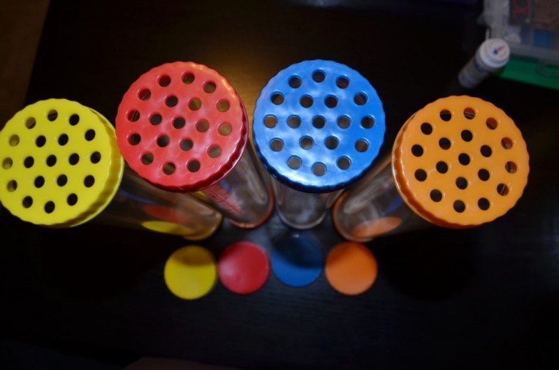 2. Töltsd meg a csöveket különböző kisebb tárgyakkal. Zárd le a tetejét az egyik fedéllel. Rázd meg a csöveket és figyeld meg, hogy melyik cső, milyen hangot ad ki.