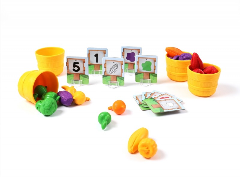 A Learning Resources szortírozó veteményeskert játéka 5 db műanyag kosarat, 25 db műanyag zöldséget (5 féle zöldség 5 féle színben), 10 db kétoldalú kártyát (egyik oldalán 2 sorozat szám 1-5-ig, másik oldalán a zöldség színe illetve formája), 5 db kártyatartót és egy polifoam játéktáblát tartalmaz. A zöldségek, a kosarak és a kártyatartók műanyagból készültek, melyek nem tartalmaznak egészségre káros anyagokat. A zöldségek között megtalálható a hagyma, a tök, a kukorica, a retek és a brokkoli. Mindegyik zöldség felülete aprólékosan kidolgozott, textúrált. Mind az 5 fajta zöldségből 5-5 db található a készletben, mindegyik különböző színű. A szettben citrom- és narancssárga, piros, zöld és lila színekben láthatóak a zöldségek. A szortírozó poharak citromsárgák, fa hordó hatását keltik. A játéktáblán 5 oszlopban találhatóak lyukak, melyekbe a zöldségek helyezhetőek, mintha épp nőnének ki a földből. Ezt a tábla felásott földet szimbolizáló képe is erősíti. A feladatkártyák kartonból készültek, a rajta lévő képek élénk színekben vannak megjelenítve. A játék dobozának belső fele is megrajzolt, a farmok jellegzetes világát tükrözi.