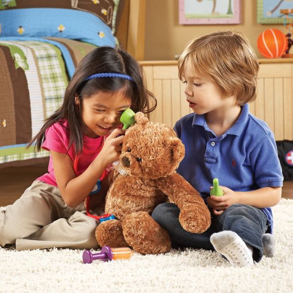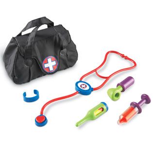 A Learning Resources doktor szettje 1 db fekete orvosi táskát, 1 db piros-kék játéksztetoszkópot, 1 db zöld-lila reflexkalapácsot, 1 db lila-piros injekciót, 1 db zöld-sárga lázmérőt és 1 db kék sebtapasz karperecet tartalmaz. Az orvosi táska textilből készült, piros keretbe foglalt fehér kereszt mintával díszített. Az eszközök mérete a gyerekek kézméretéhez lettek kialakítva, így markolatuk széles, méretük nagy. A játék műanyag elemei károsanyagmentes anyagból készültek. Anyagukból adódóan könnyen tisztántarthatóak. A csomagolás mérete: 30x23x11 cm 2 éves korú gyermekek számára CE minősítéssel ellátva!