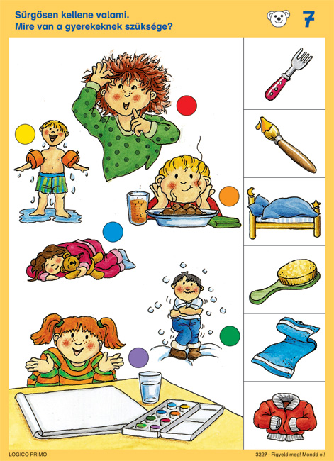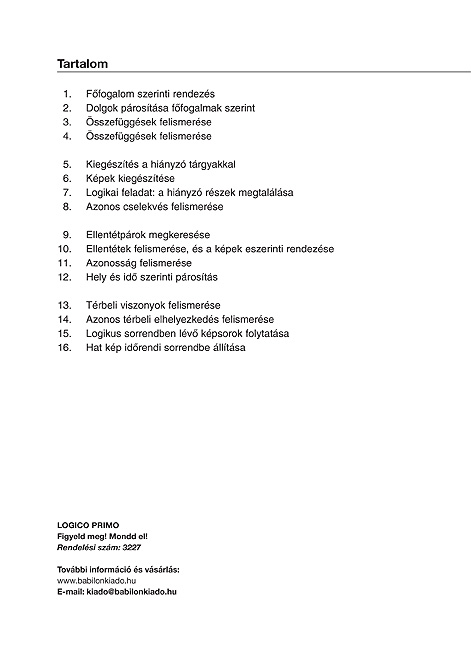 A LOGICO PRIMO innovatív tanulójáték – az óvodások napirendjébe beépíthetően. - A következő területek fejlesztéséhez kínál játékos gyakorlatokat: érzékelés, koncentráció, mennyiségek és színek ismerete, térbeli tájékozódás, nyelvi kifejezésmód, tárgyi információk, valamint hozzárendelések és analógiaképzés révén logikai összefüggések keresése. - A Figyeld meg! Mondd el! az alábbi témákat dolgozza fel: főfogalmak, forma-terület-pozíció, hely és idő.
