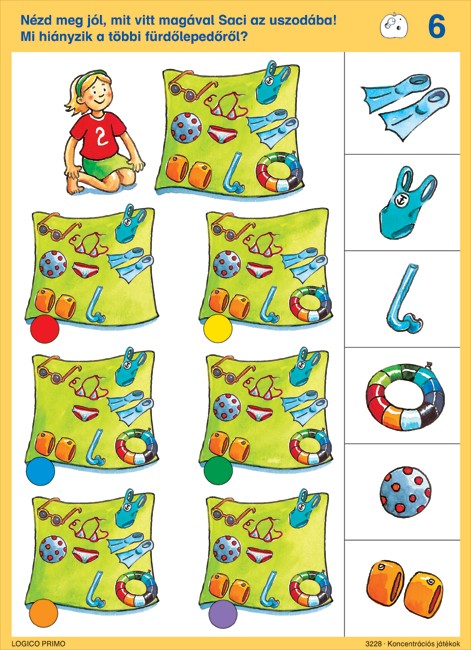 Koncentrációs játékok (3228a) fejlesztőkártya-csomag játékos módon segíti a 3–6 éves gyermekek figyelmének, koncentrációjának és megfigyelőképességének fejlesztését.