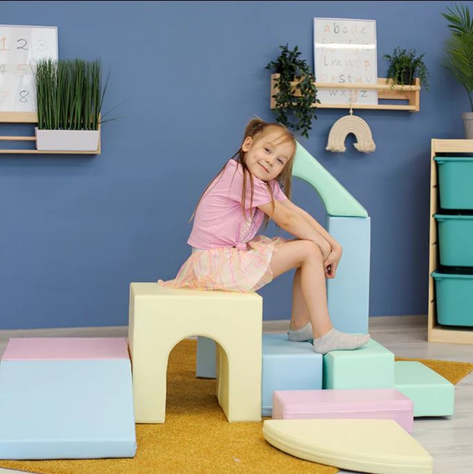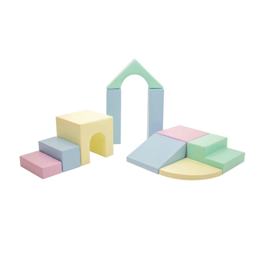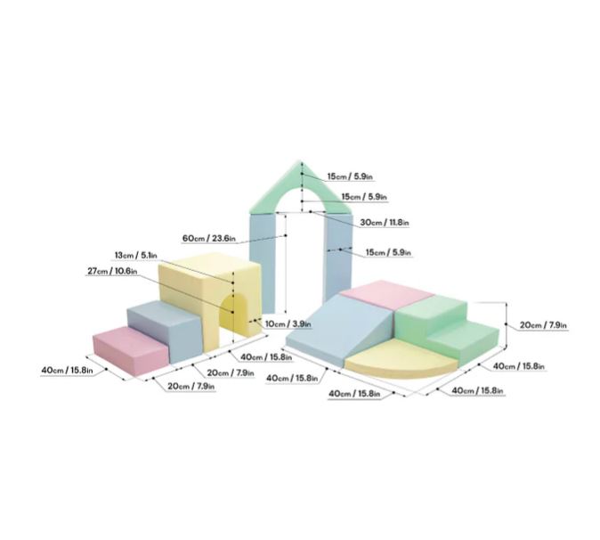 Tartalma: - 1 db 10x20x40 cm-es lapos téglalap - 1 db 20x20x40 cm-es nagy téglalap - 1 db 30x15x60 cm-es háztető - 1 db 40x40x40 cm-es alagút - 2 db 15x15x30 cm-es kis gerenda - 1 db 20x40x40 cm-es lapos kocka - 1 db 20x40x40 cm-es kis lépcső - 1 db 20x40x40 cm-es kis lejtő - 1 db 5x40 cm-es kör cikk A termék lágy pasztell színekkel lett kialakítva. Az elemek mind puha habszivacs töltettel rendelkeznek, borításuk műbőr. A rejtett zipzároknak köszönhetően semmilyen kiálló vagy kemény részlete nincs, így megakadályozva az esetleges balesetek kialakulását. Műbőr bevonatának köszönhetően nedves ruhával könnyedén tisztán tartható. 12 hónapos korú gyermekek használatára CE minősítéssel ellátva! Ajánlott korosztály: 1 – 5 év