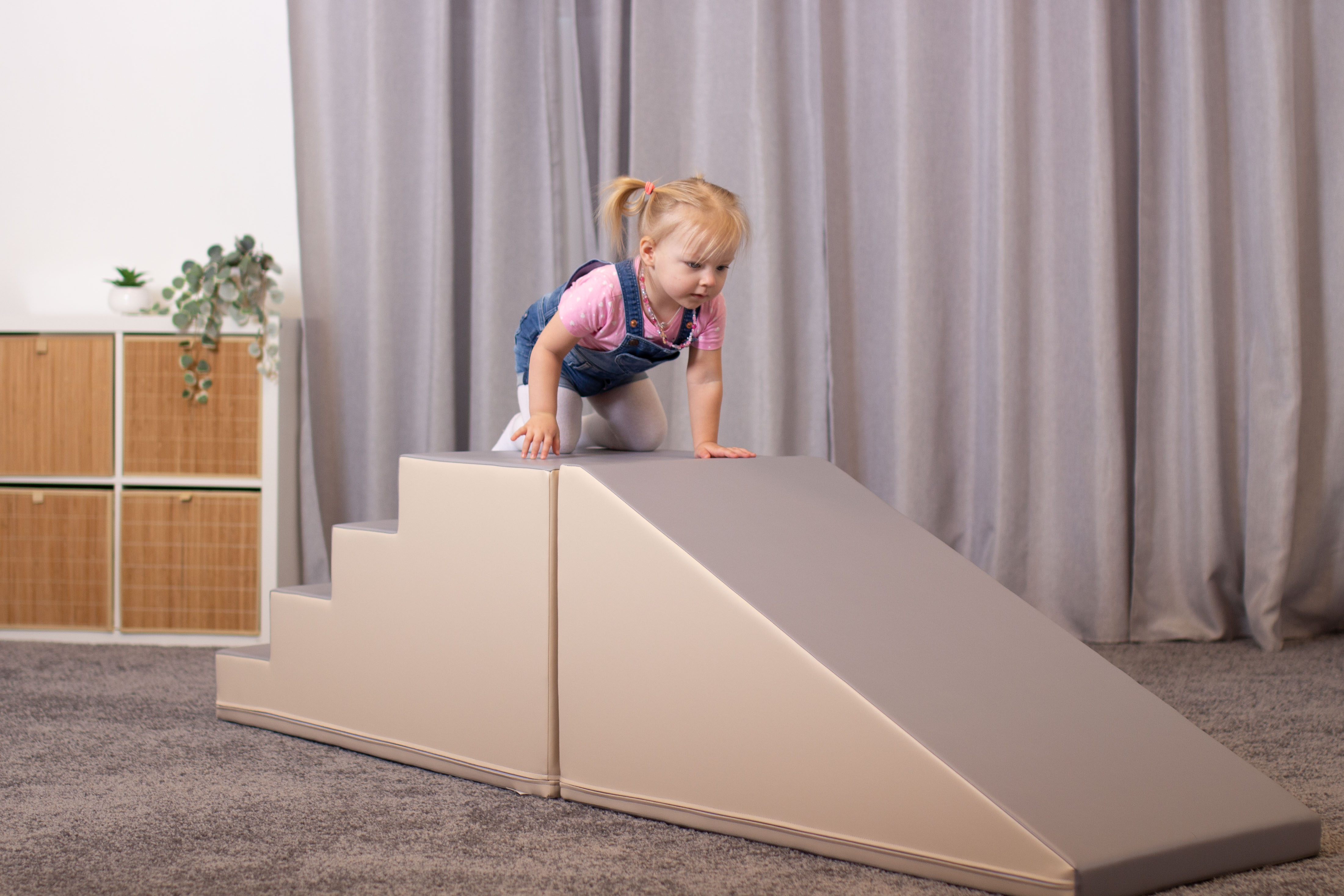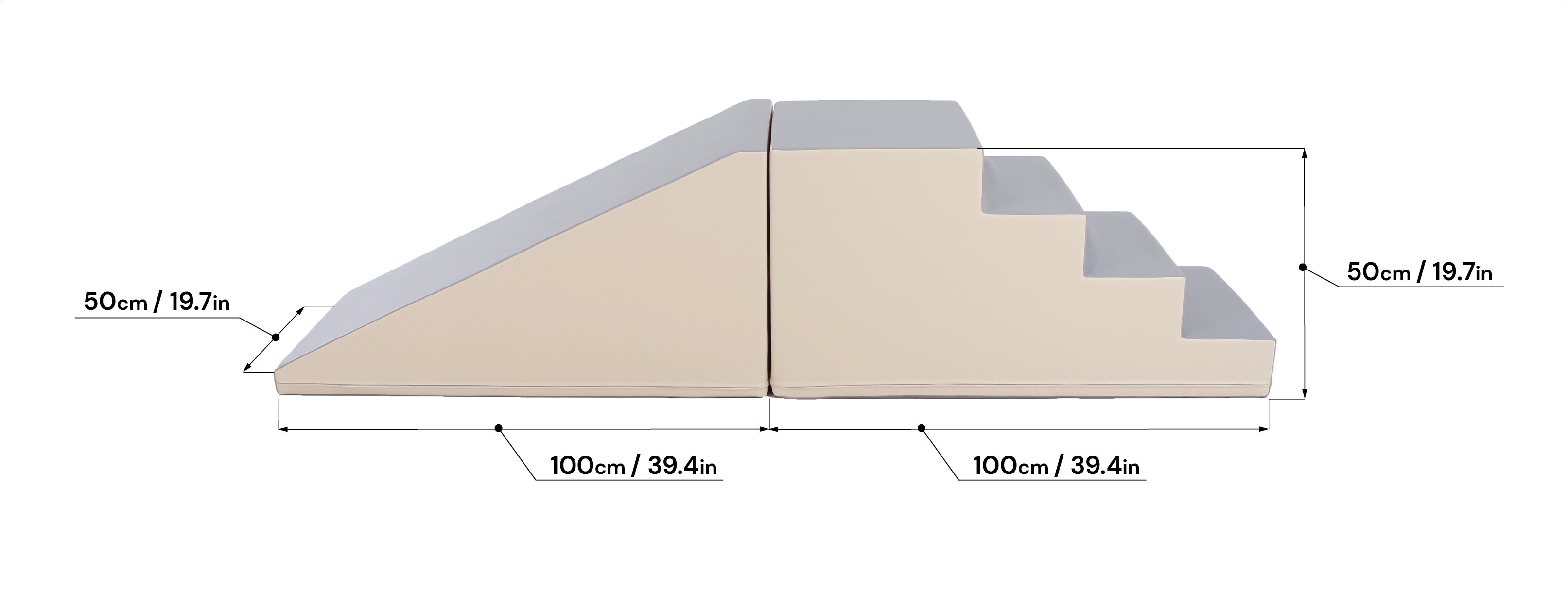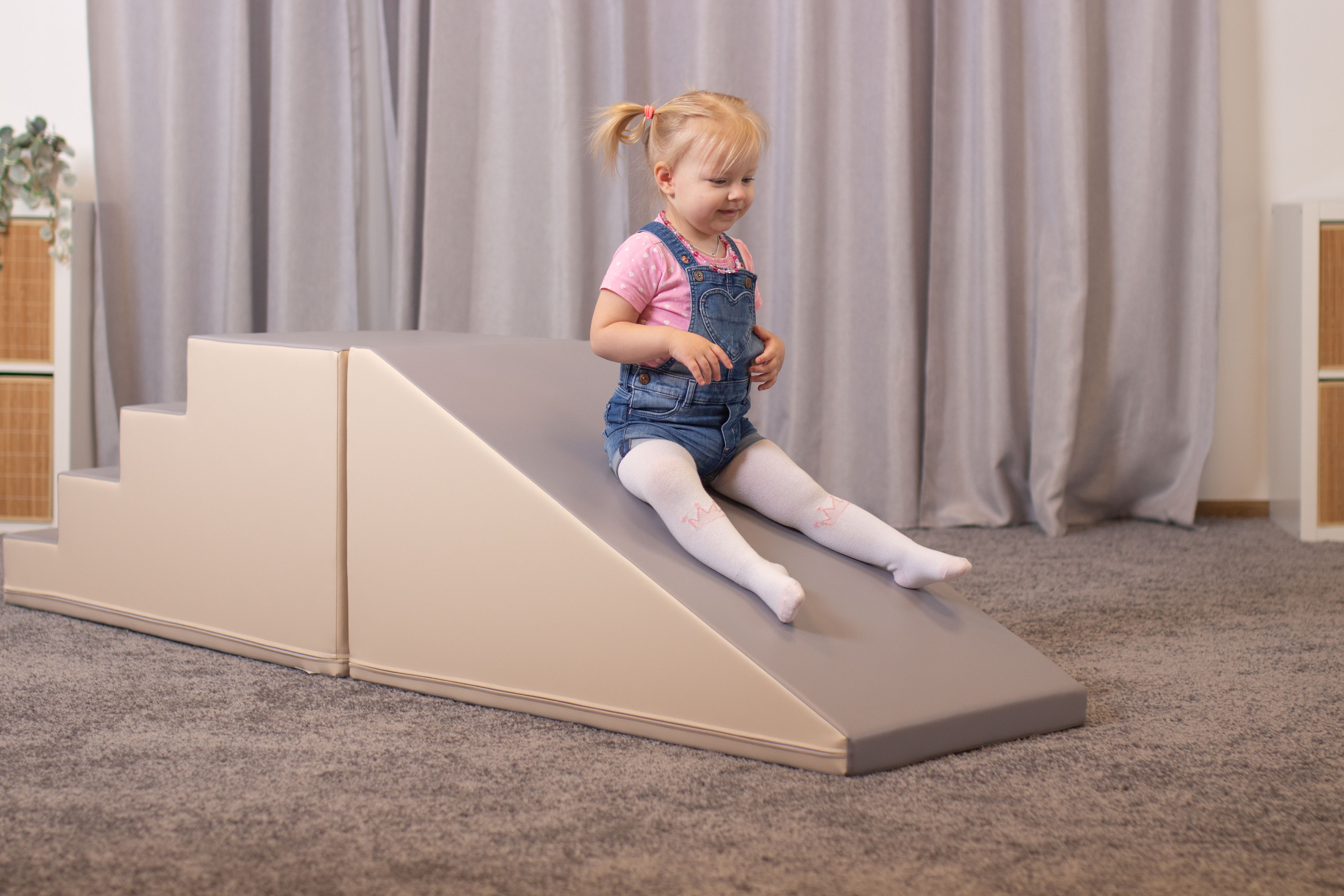 A modulkészlet lehetővé teszi, hogy a gyerekek másszanak, csússzanak, felfedezzenek. A szett a tartós használatra van tervezve, így hosszú órákig biztosít szórakozást. Tartalma: - 1 db 50x50x100 cm-es nagy lépcső - 1 db 50x50x100 cm-es nagy lejtő 100%-ban újrahasznosítható, magas minőségű habból készülnek, zárt cellás szerkezettel – puhák és rendkívül könnyűek. Az anyagot erős műbőr borítja. A formák robusztusak, kellemes tapintásúak, könnyen tisztíthatók, jól megőrzik alakjukat, és káros anyagokkal szemben teszteltek. A termék 12 hónapos korú gyermekek használatára CE minősítéssel ellátva! A termék színe esetlegesen eltérhet a képen látottól. Ajánlott korosztály: 1 – 7 év