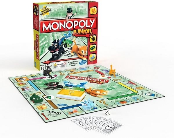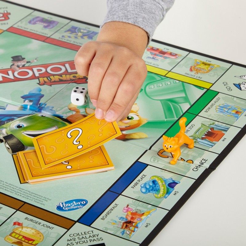 A klasszikus ingatlankereskedelmi játék speciálisan gyermekek számára tervezett változata. Az üres telkekre különböző boltokat, és belépődíjat szedhetünk a többiektől. Szerencsekártyák, és a négy új Monopoly Junior figura teszi még izgalmasabbá a játékot.