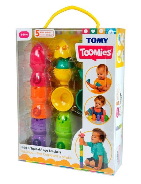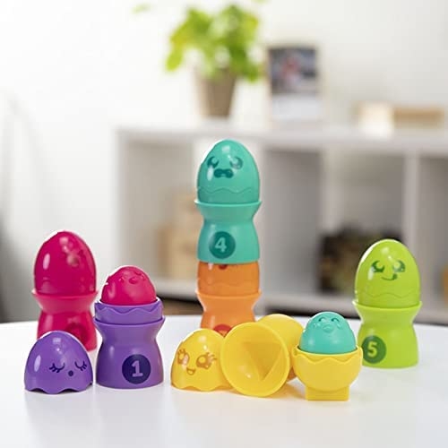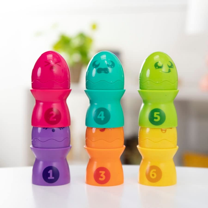 Nincs is jobb, mint egy vidám építkezős játék, főleg ha színes tojáskákat kell egymásra építeni. A kis tojások aranyos csibéket rejtenek, melyek még kedvesebbé és izgalmasabbá teszik az építést. Az élénk és vidám színek lekötik a gyerekek figyelmét, ösztönzik őket a játékra. A tojásokon és a csibéken is különböző arckifejezések láthatók, melyek akár az egyes érzelmek megtanulására is lehetőséget adnak. A tojástartókon szereplő számok megmutatják a helyes sorrendet, továbbá a számok tanulását, a számképek megismerését is elősegítik. A különböző színű tojások egymással is összeilleszthetők. 6 hónapos korú gyermekek használatára CE minősítéssel ellátva!