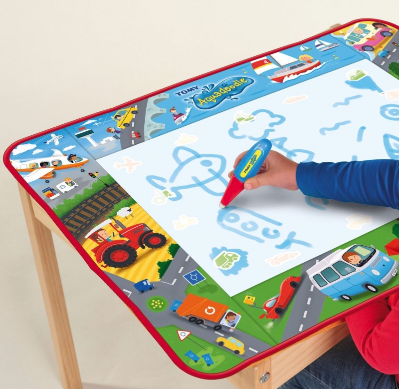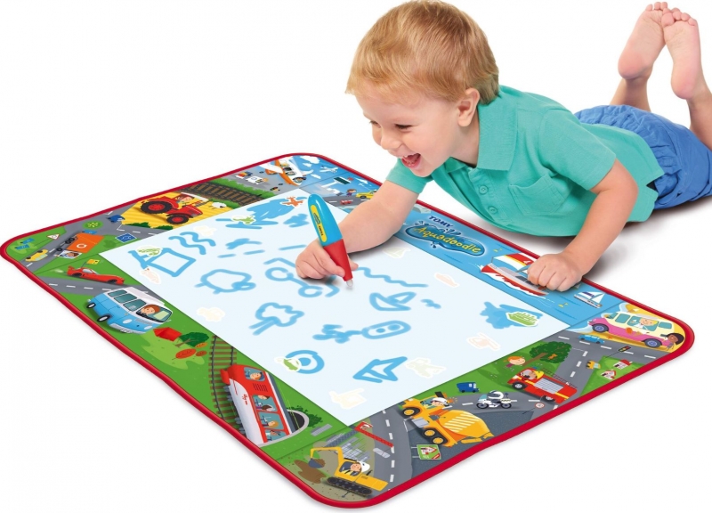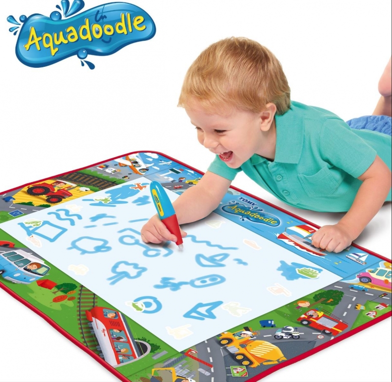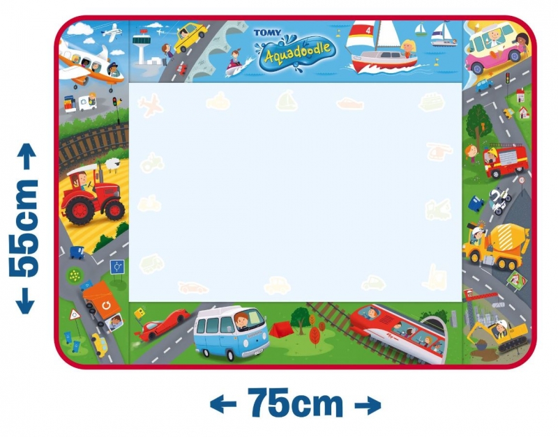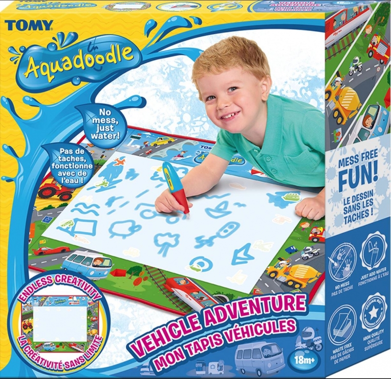 Az Aquadoodle rajzszőnyeg minden kisgyermeket elvarázsol. A szőnyegre a különleges Aquadoodle tollal lehet rajzolni, aminek tartályát vízzel kell megtölteni, majd kezdődhet is az alkotás! Az egyedi játékszőnyeg színe megváltozik, amint a vizes toll hozzáér, így jelenik meg a rajzolt minta. Mikor a víz megszárad, a kép is eltűnik és újra indulhat a móka. A szőnyegen előre felvázolt járművek találhatók, amiket a gyerekek át tudnak rajzolni. Tömegközlekedési járművek, munkagépek, autók, motorok, mind-mind fellelhetőek a szőnyegen.