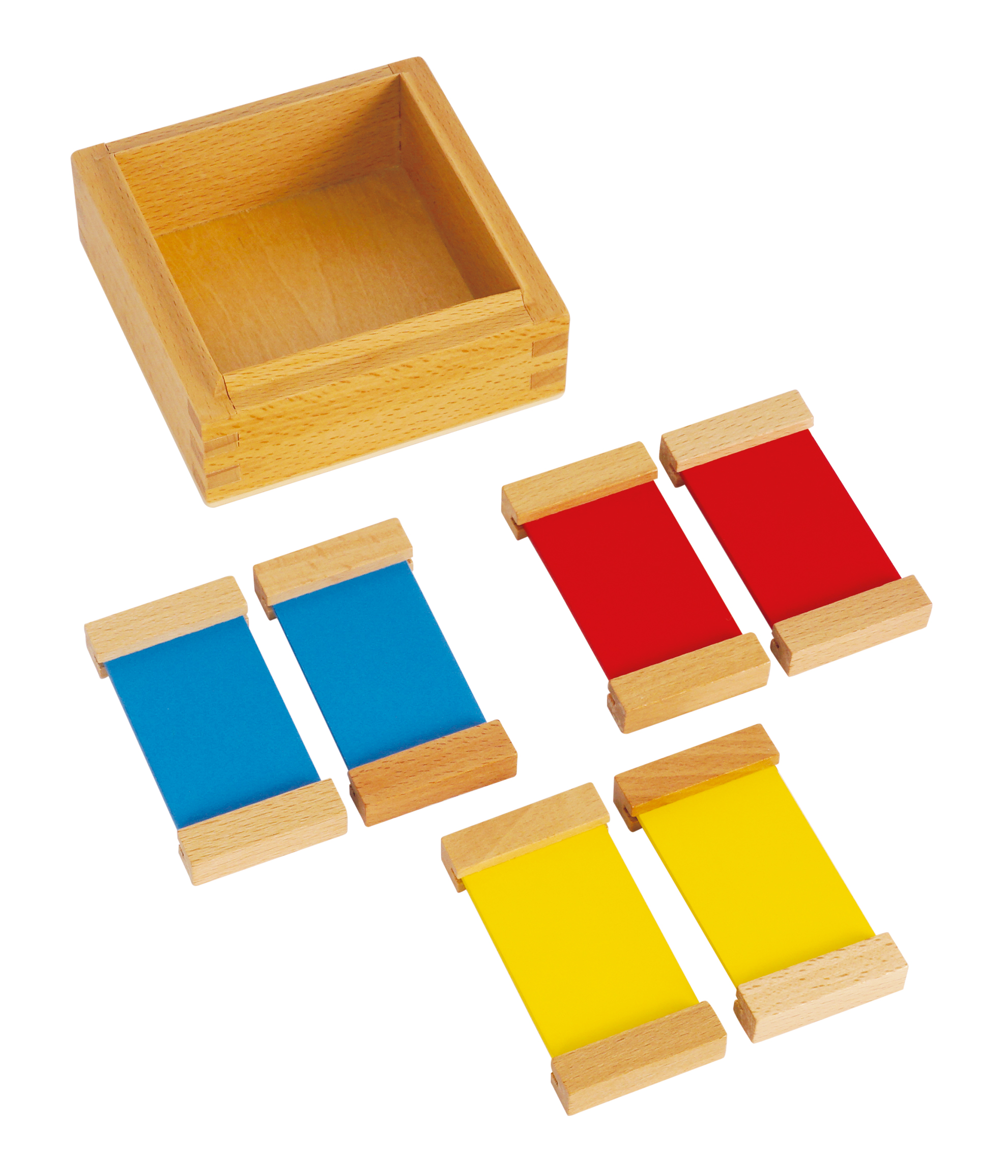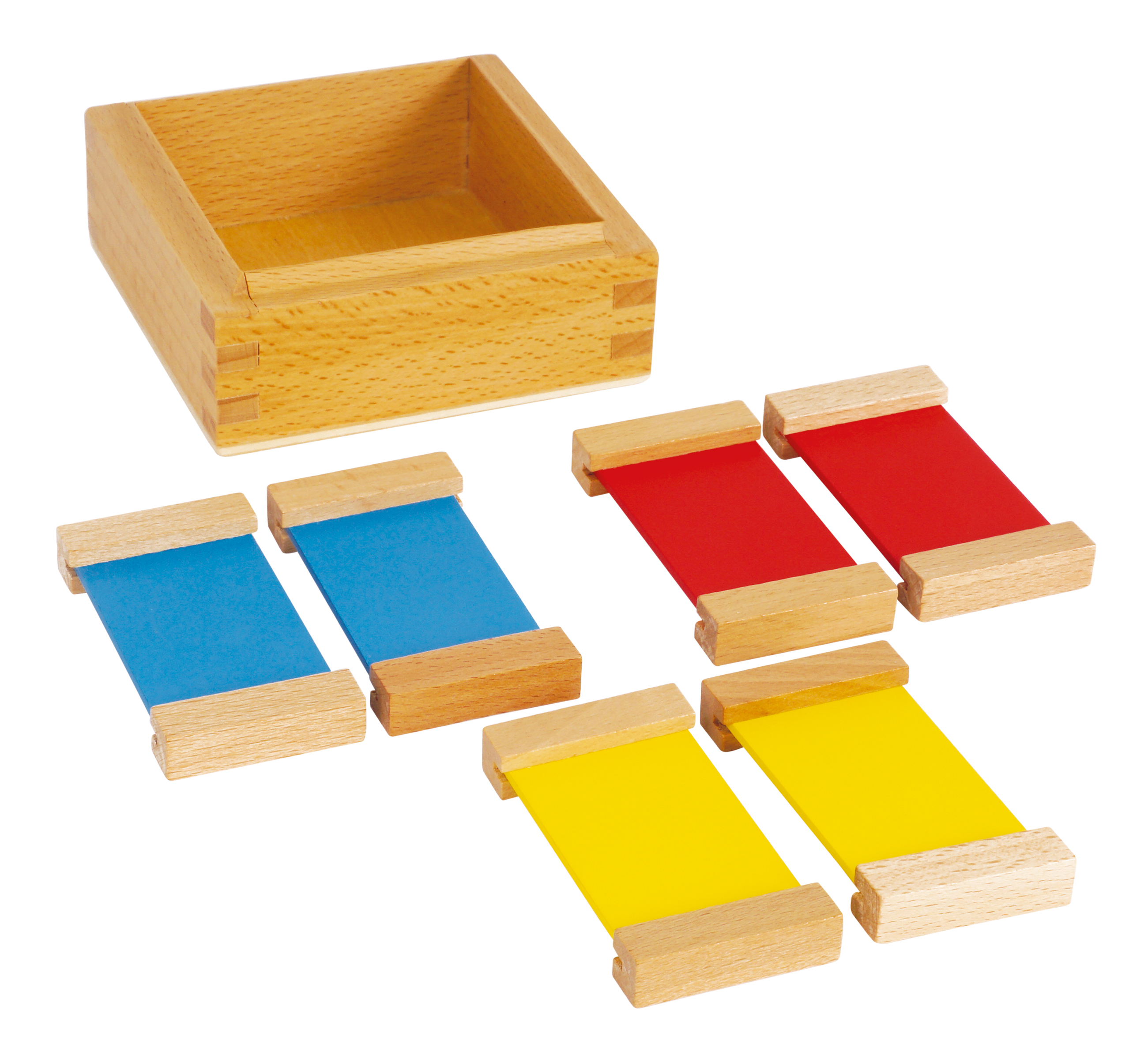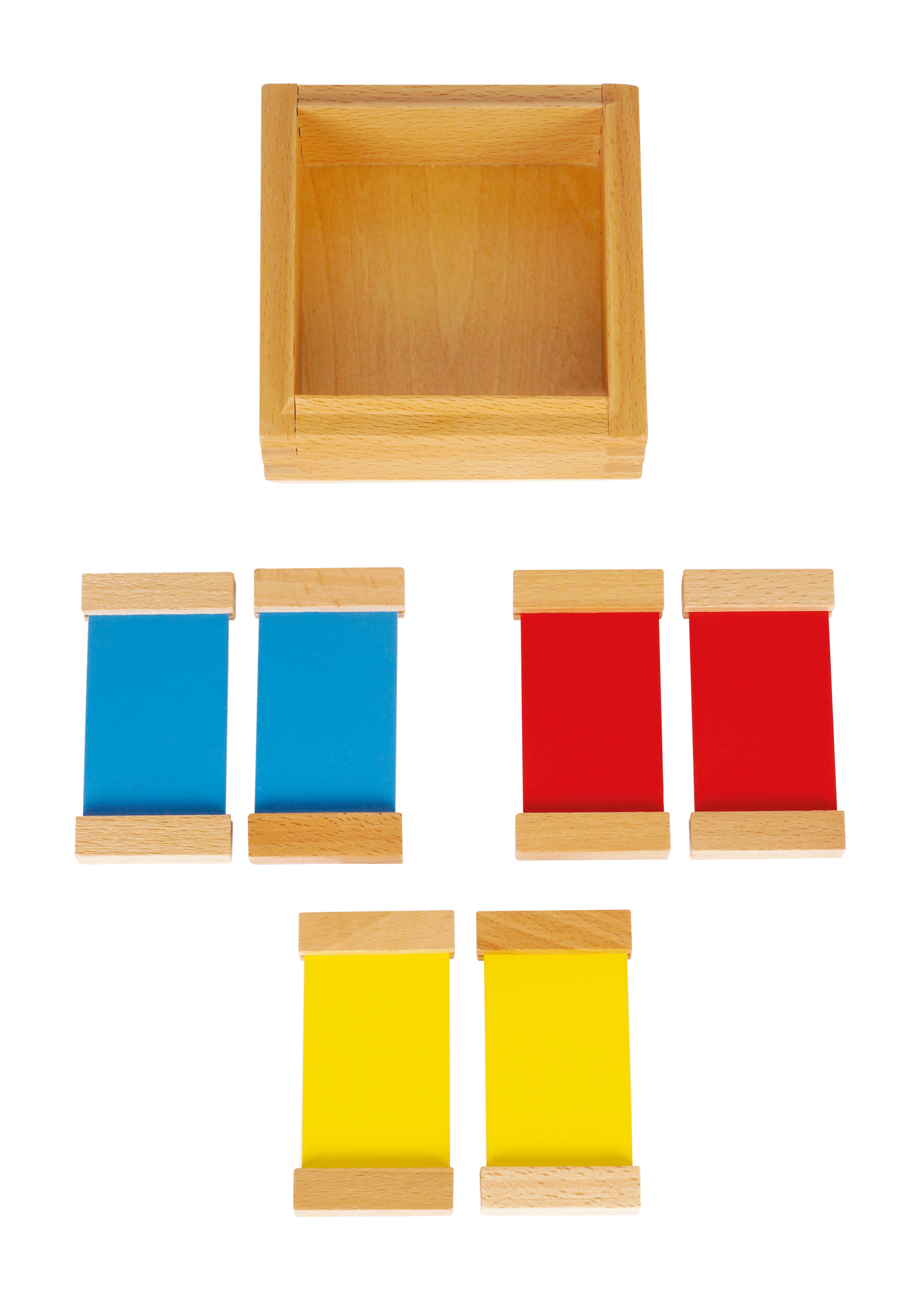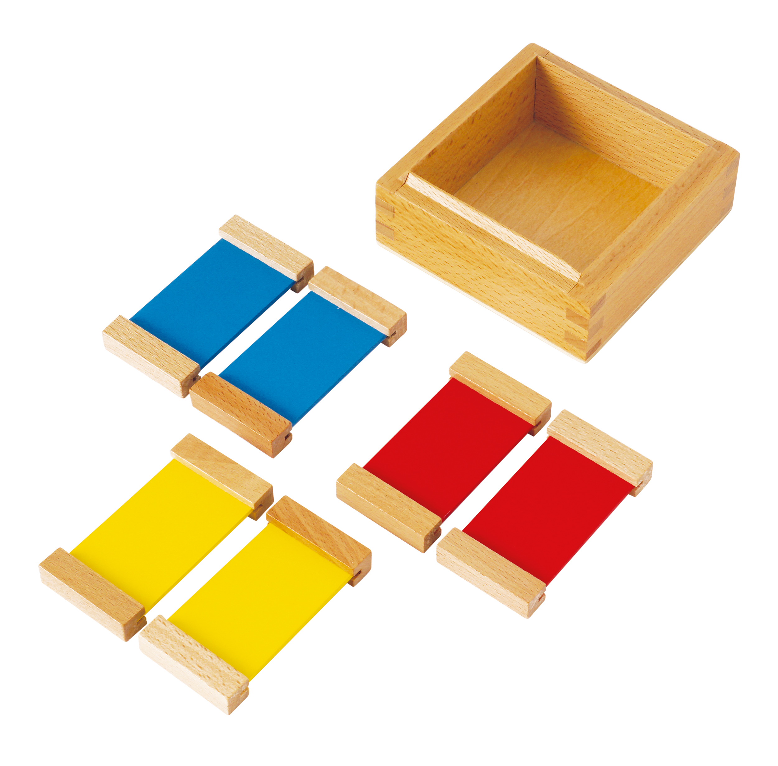 A Montessori Színtábla készlet tartalma: 6 színkártya (3 pár alap színből: piros, sárga és kék), fából 1 fa doboz tetővel a színkártyák tárolására. Doboz mérete: kb. 9,4x9,4x4,8 cm Színkártyák: kb. 7,0x2,5x1 cm. Anyaga: fa