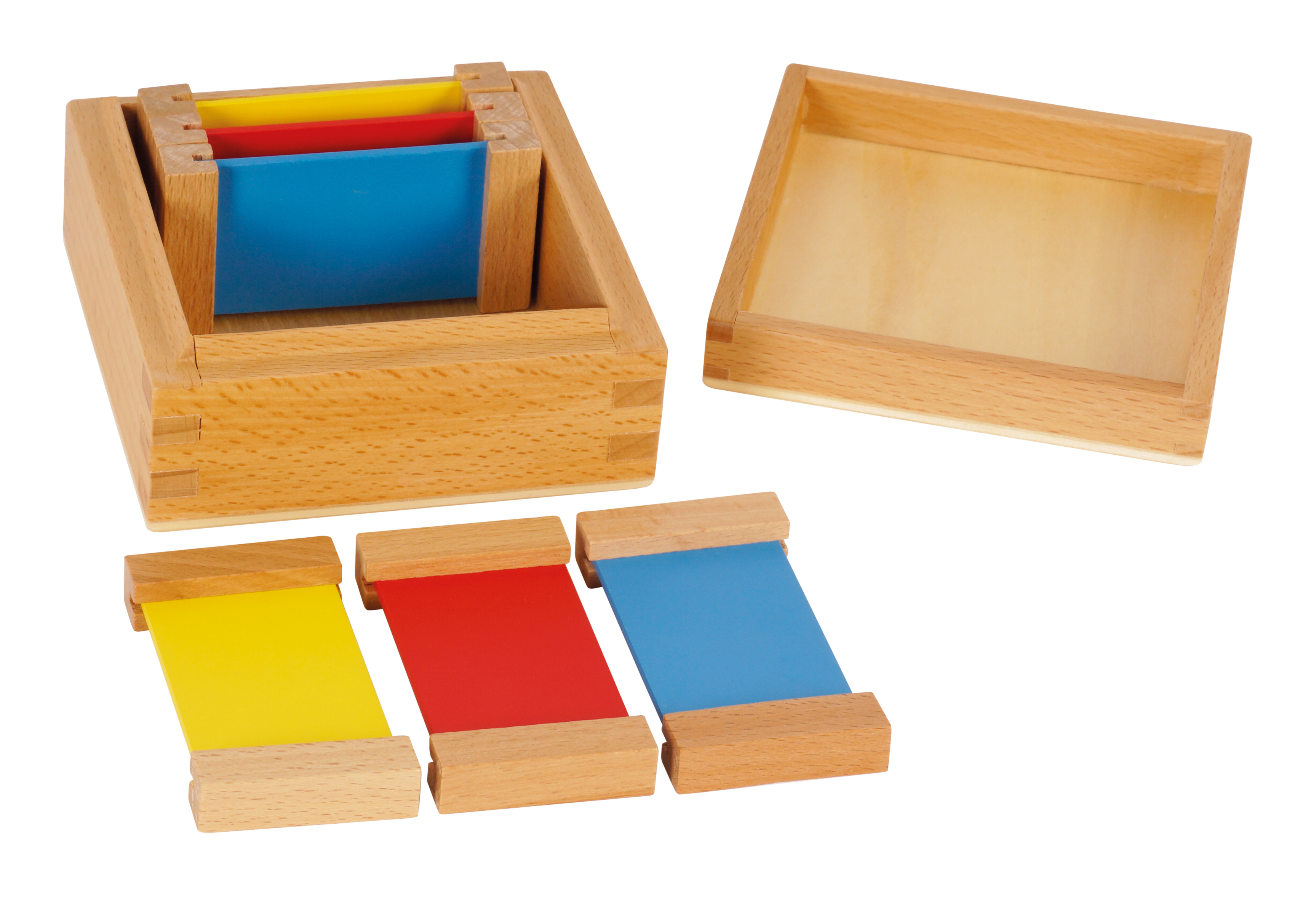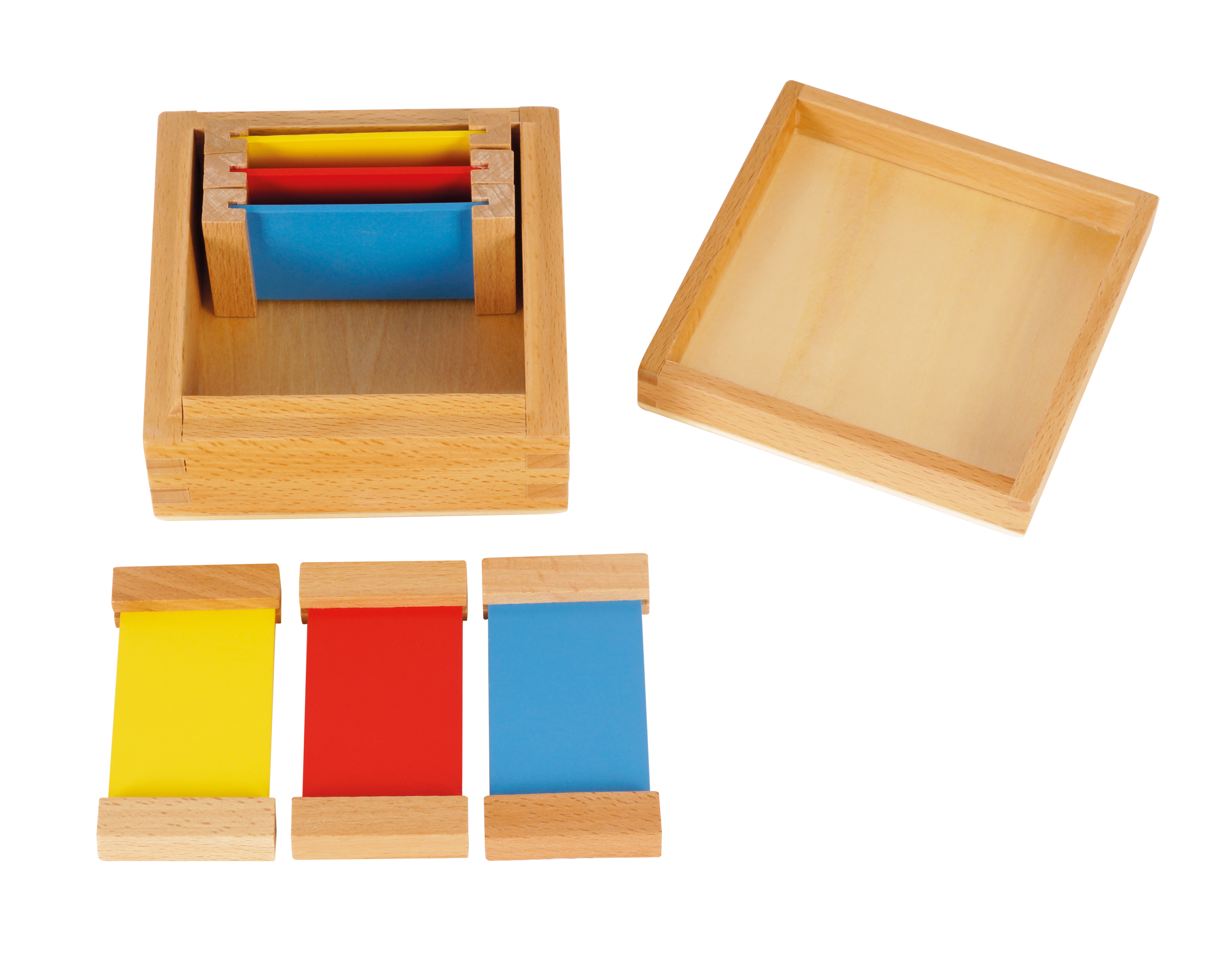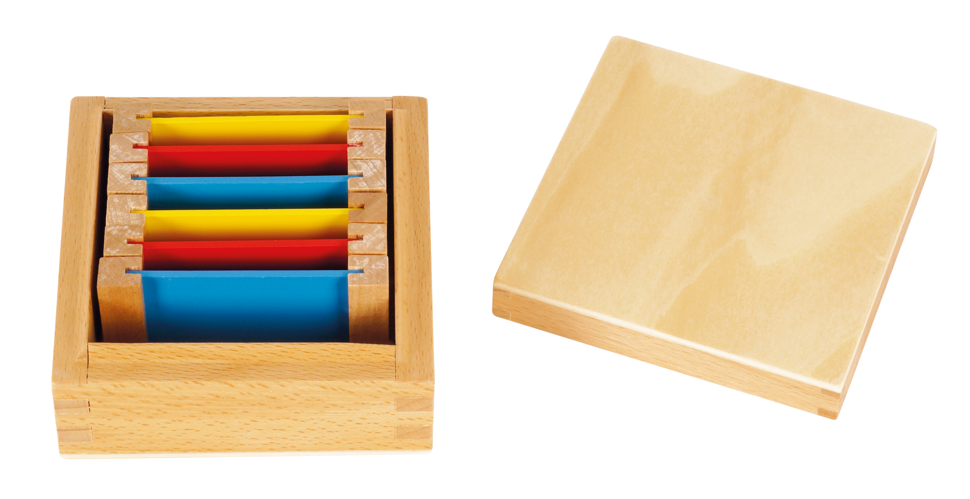 A Montessori Színtábla készlet tartalma: 6 színkártya (3 pár alap színből: piros, sárga és kék), fából 1 fa doboz tetővel a színkártyák tárolására. Doboz mérete: kb. 9,4x9,4x4,8 cm Színkártyák: kb. 7,0x2,5x1 cm. Anyaga: fa
