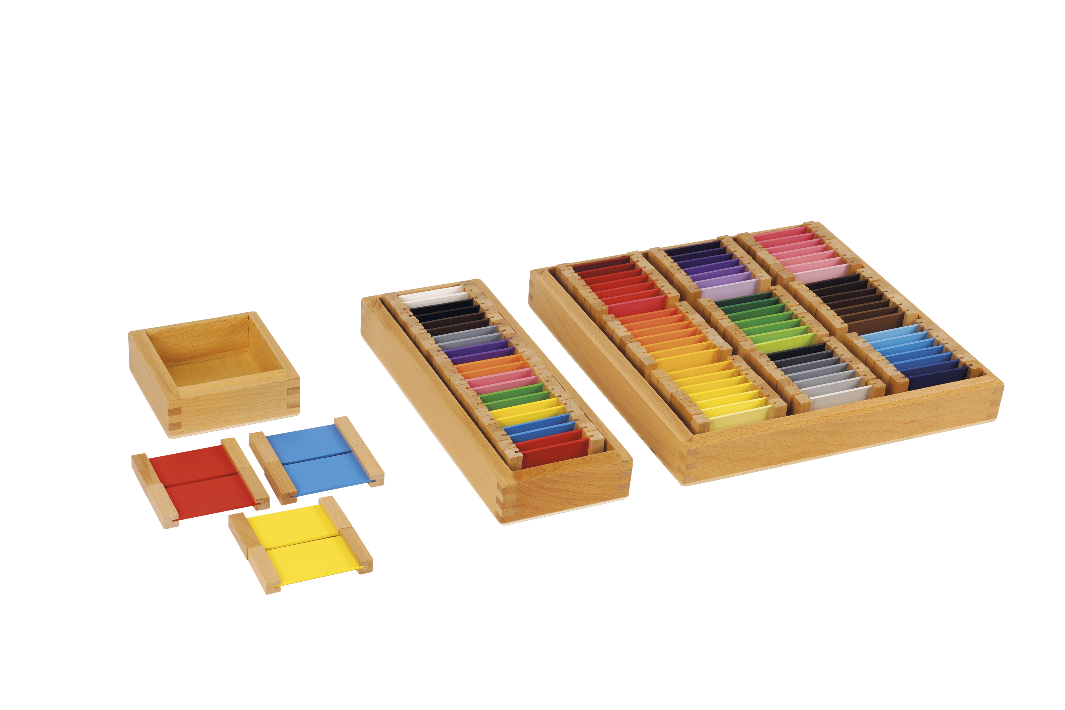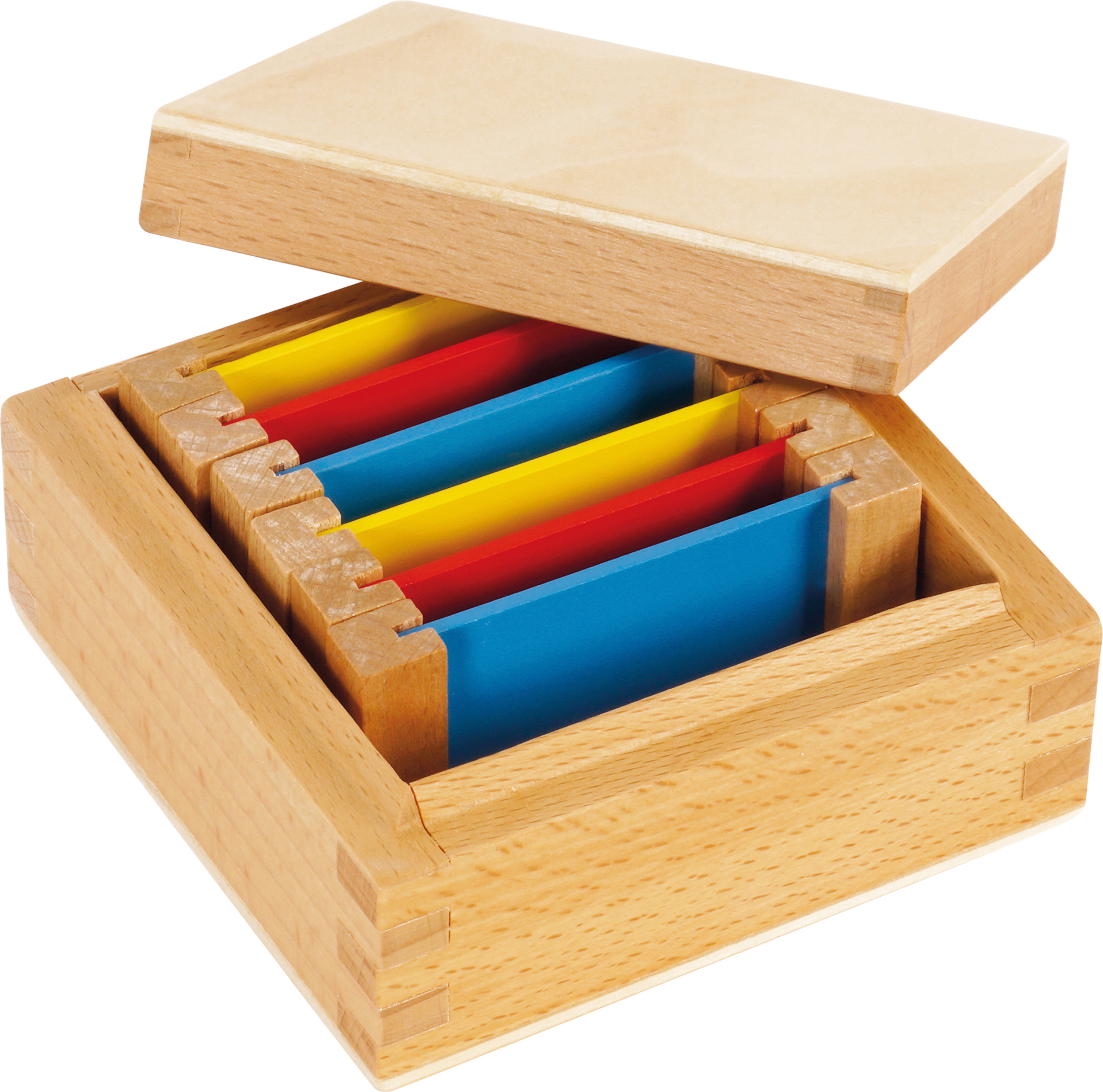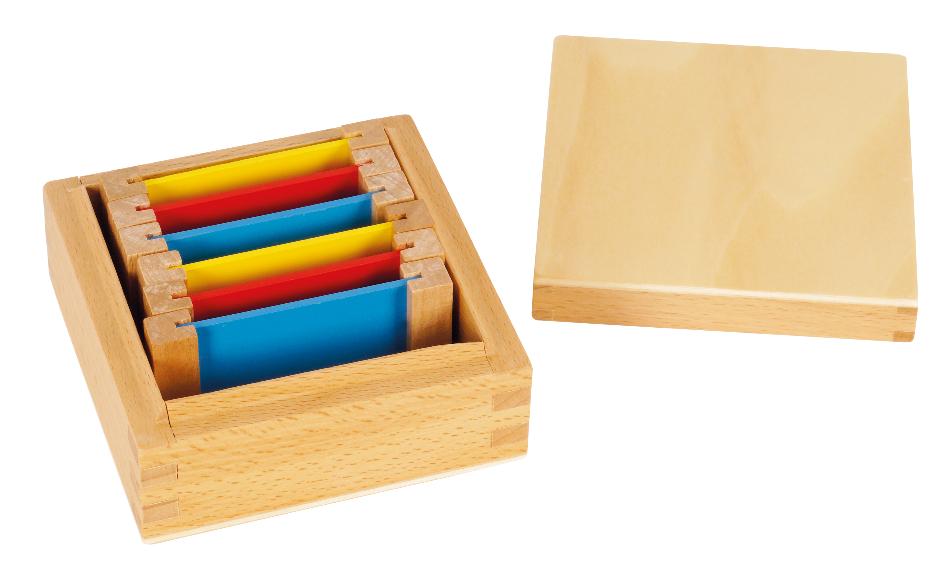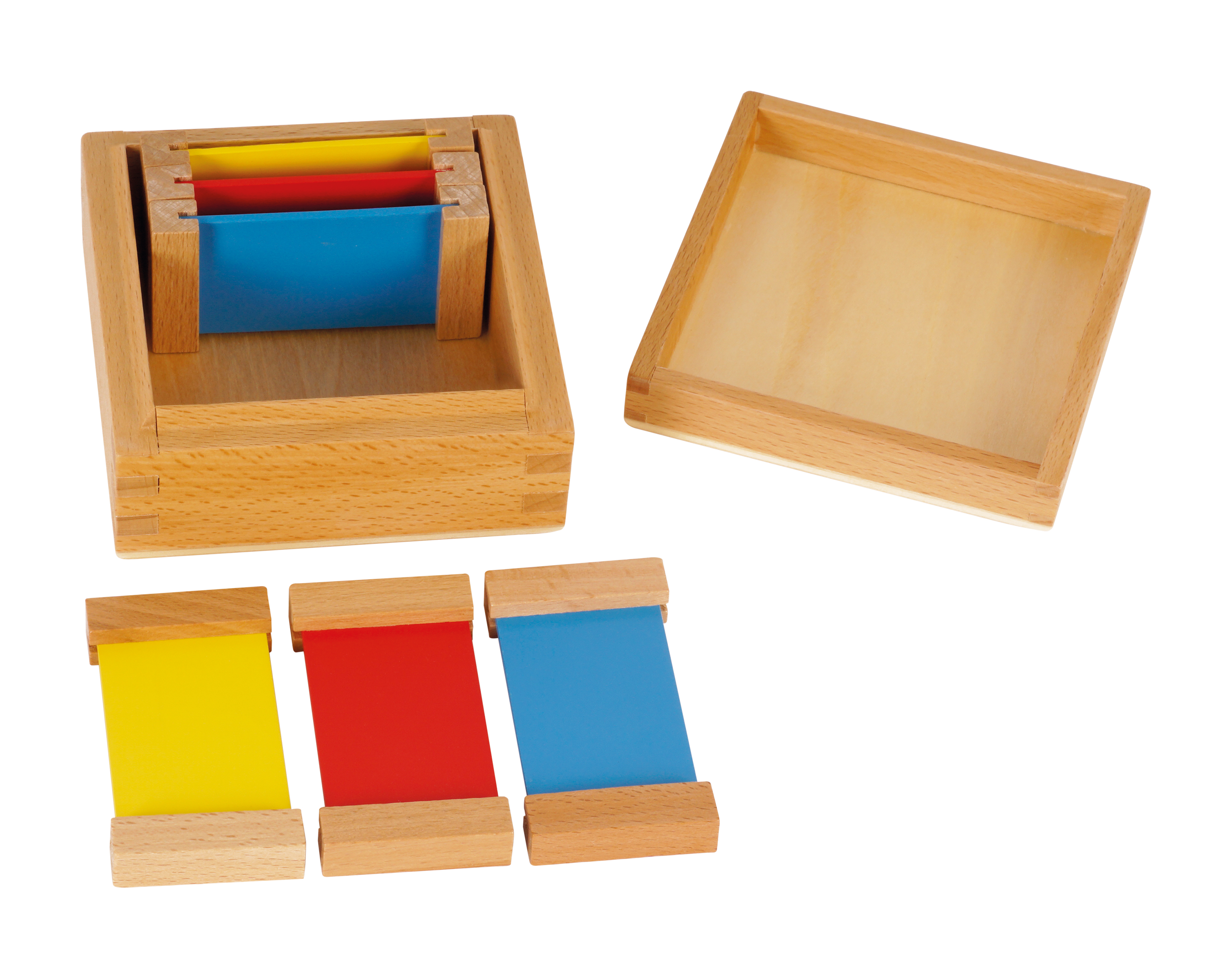 A Montessori Színtábla készlet tartalma: 6 színkártya (3 pár alap színből: piros, sárga és kék), fából 1 fa doboz tetővel a színkártyák tárolására. Doboz mérete: kb. 9,4x9,4x4,8 cm Színkártyák: kb. 7,0x2,5x1 cm. Anyaga: fa