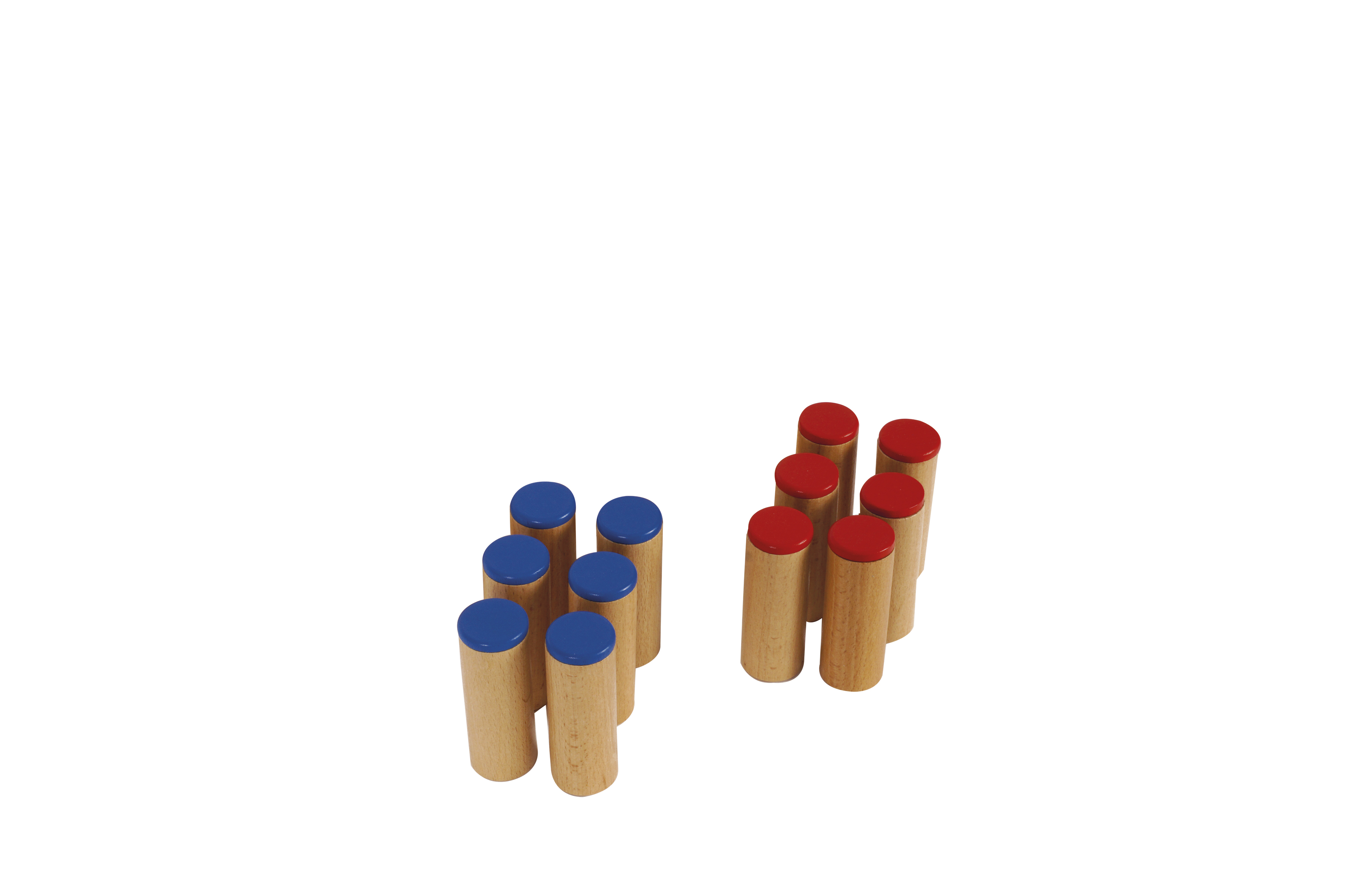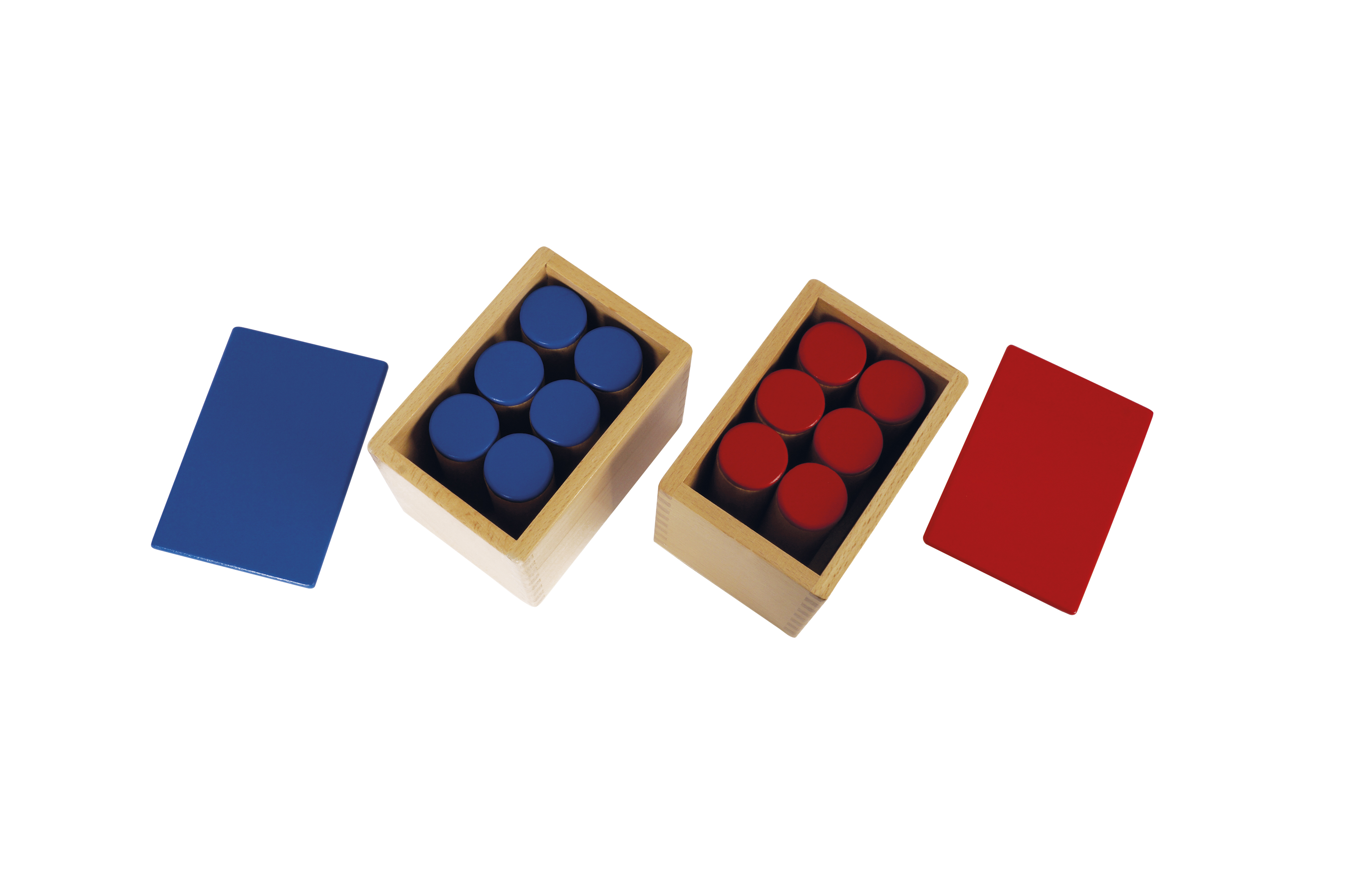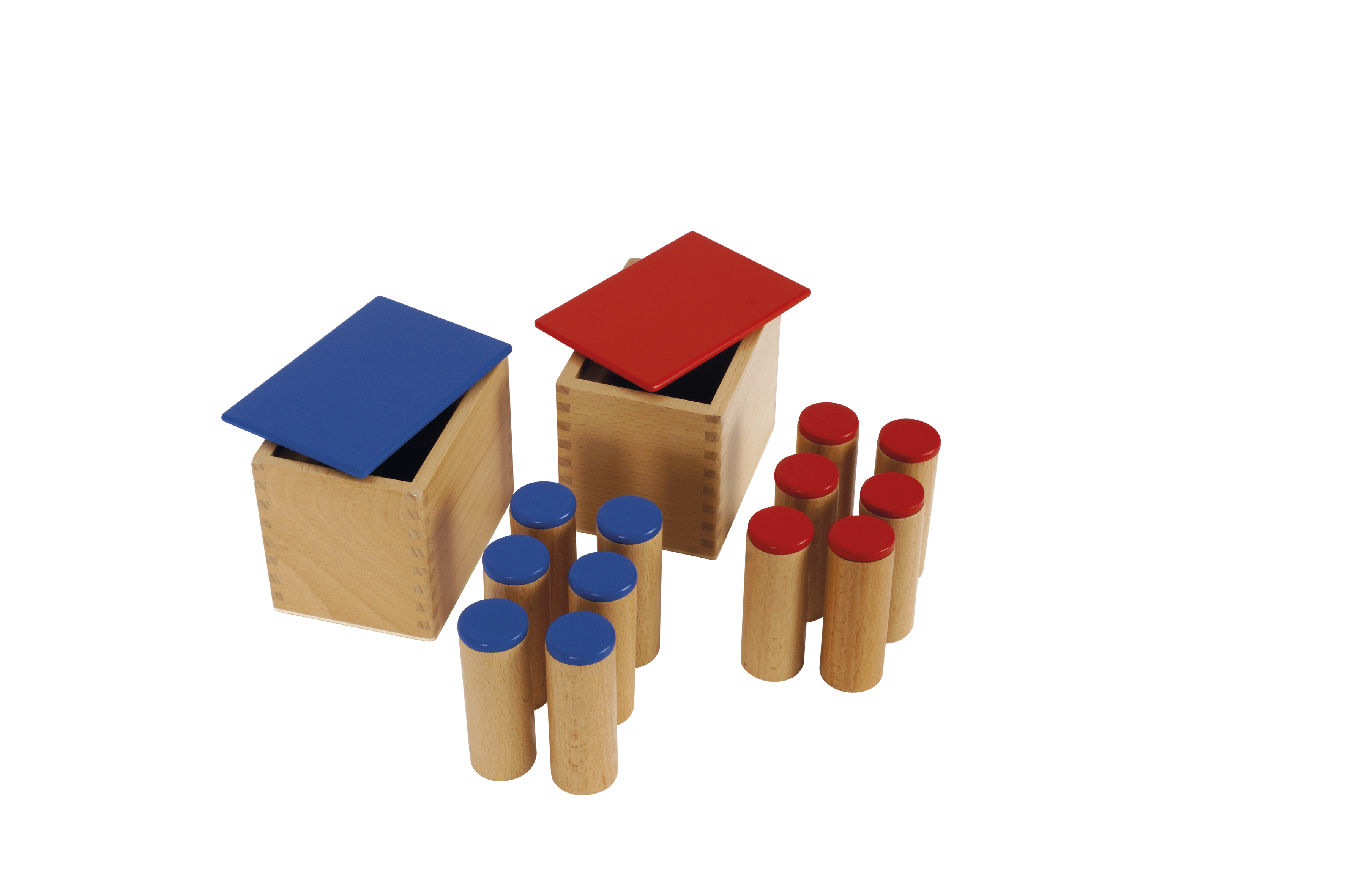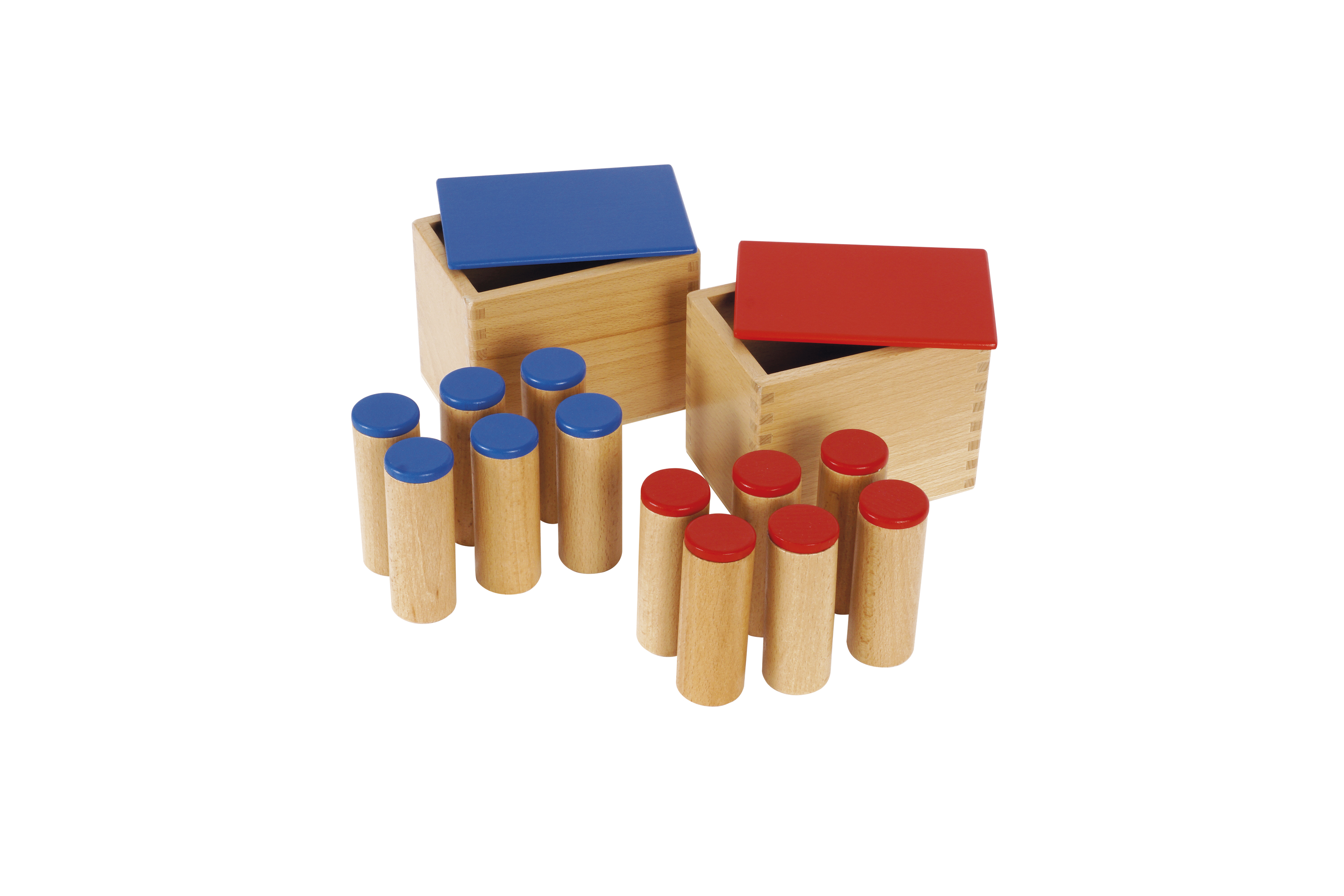 Doboz mérete: 12,5x10,2x9 cm Fa henger mérete: kb. 2,5 cm átmérőjű, 8 cm magas. Anyaga: bükkfa A készlet 2 dobozból (piros fedelű és kék fedelű) áll, melyek 6 db piros fedelű és 6 db kék fedelű hanghengert tartalmaznak. A hengerek különböző hangokat adnak ki, amikor megrázzák őket. A hengerek többek között rizst, homokot és követ tartalmaznak. A játék segít a különböző hangok megkülönböztetésében, a hallási memória fejlesztésében, miközben a figyelmüket és koncentrációjukat is javítja.