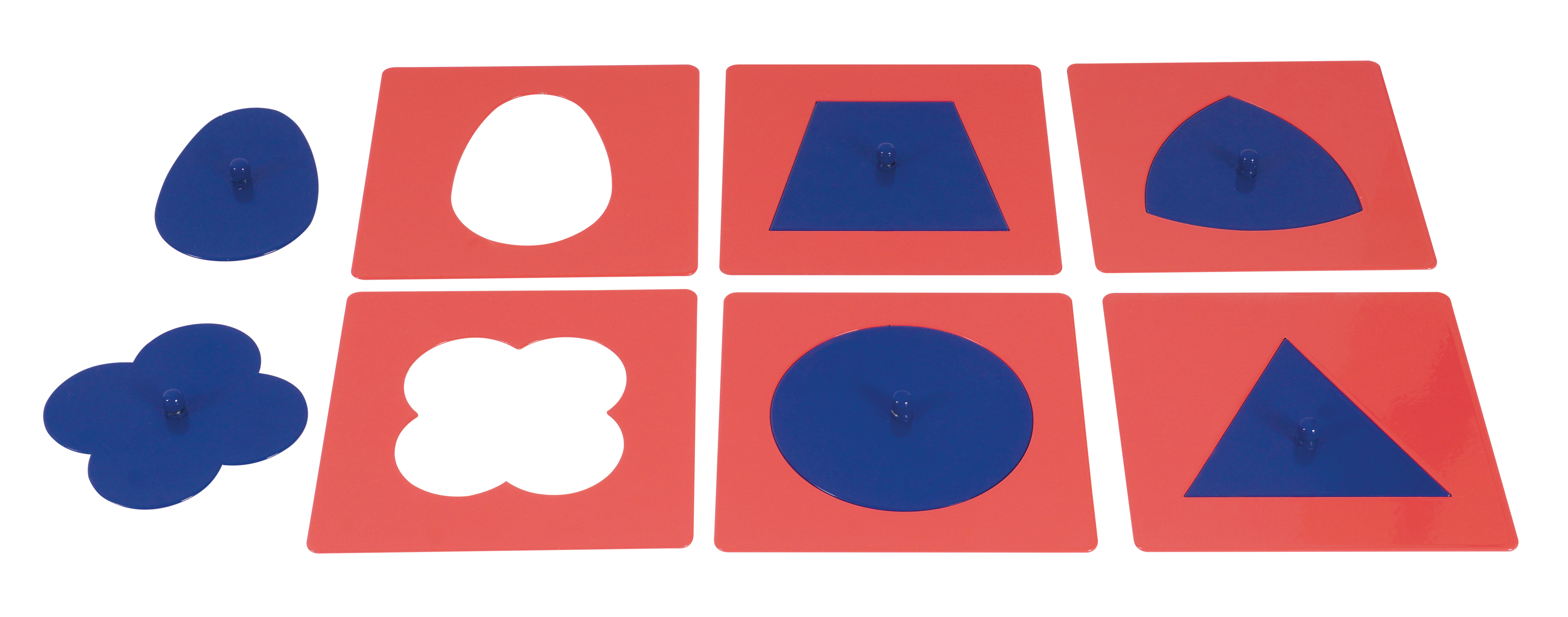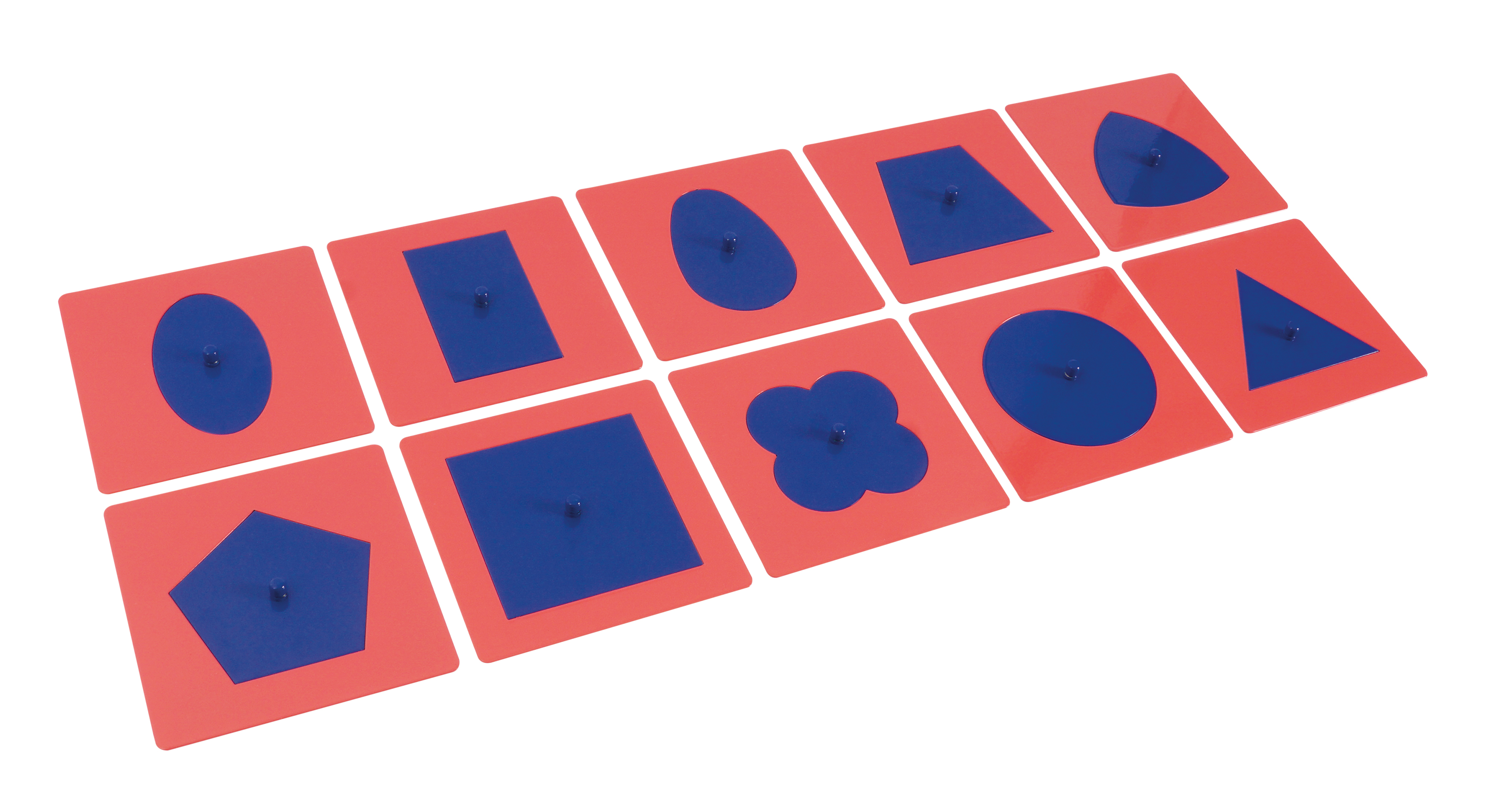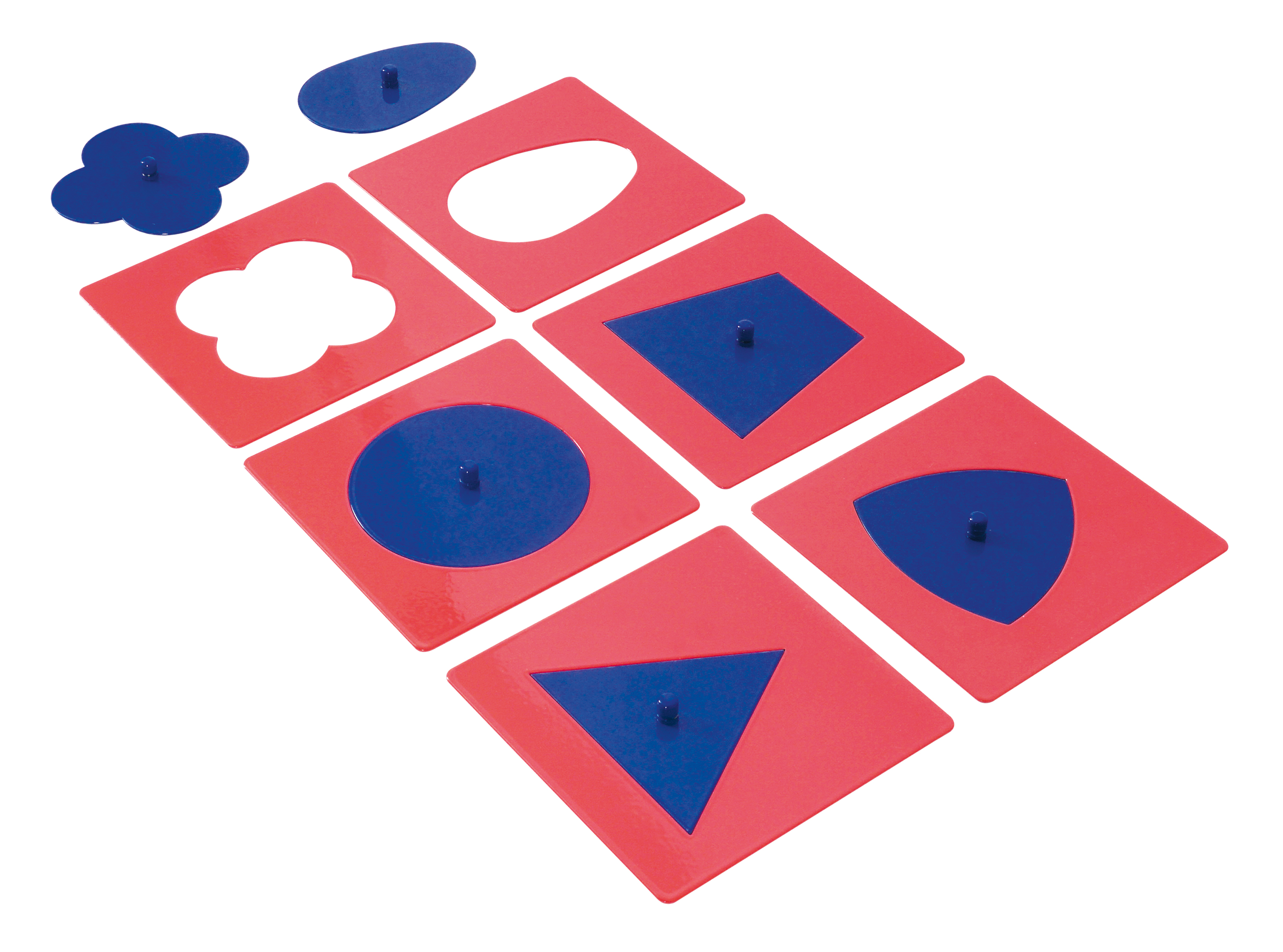 "A készlet 10 geometriai formát tartalmaz, melyek kék fém behelyezőkből készültek, mindegyik közepén egy kis megfogható gombbal, amely lehetővé teszi azok egyszerű kiemelését. A kék formákat rózsaszín keretek veszik körül, melyek külső szegélye négyzet alakú, míg belső szegélyük a geometriai alakzat negatívját alkotja.