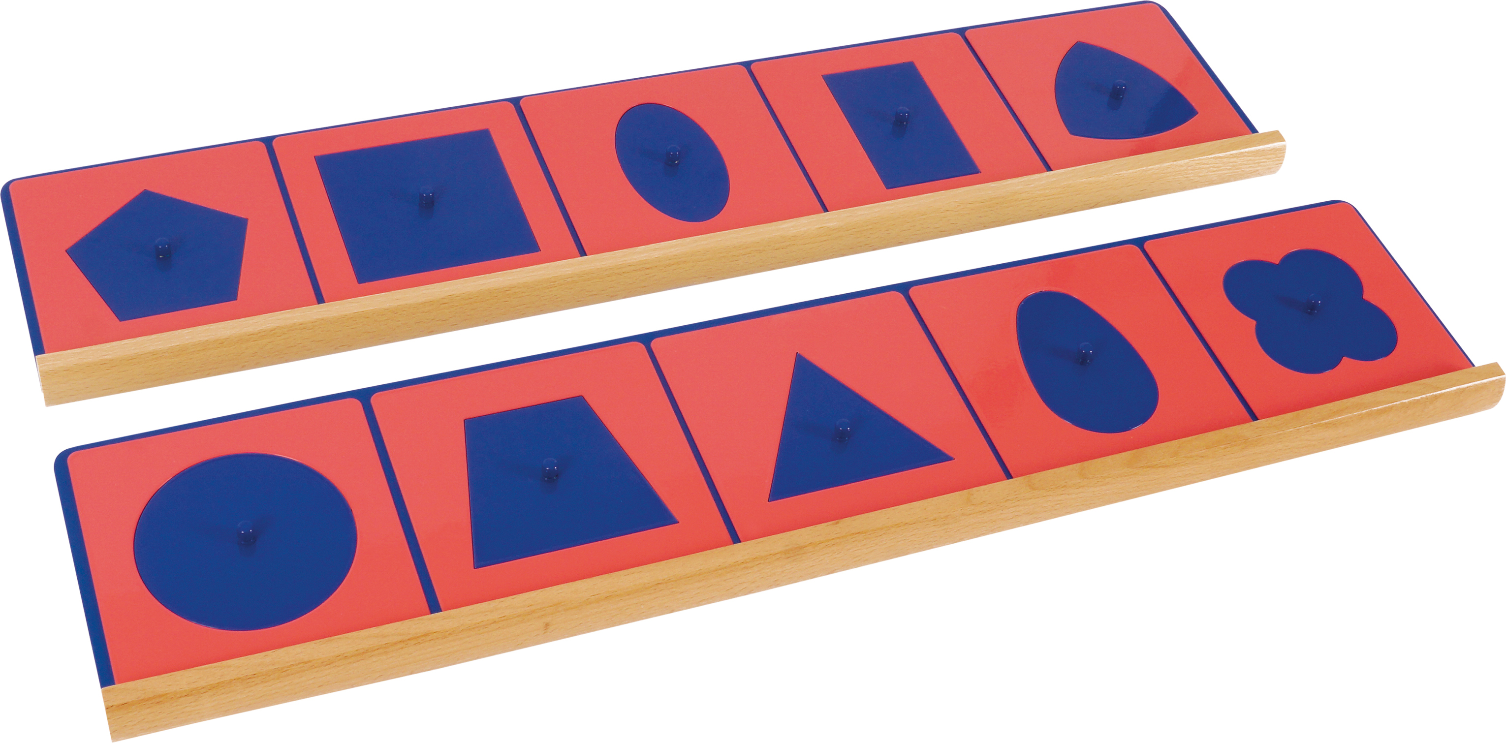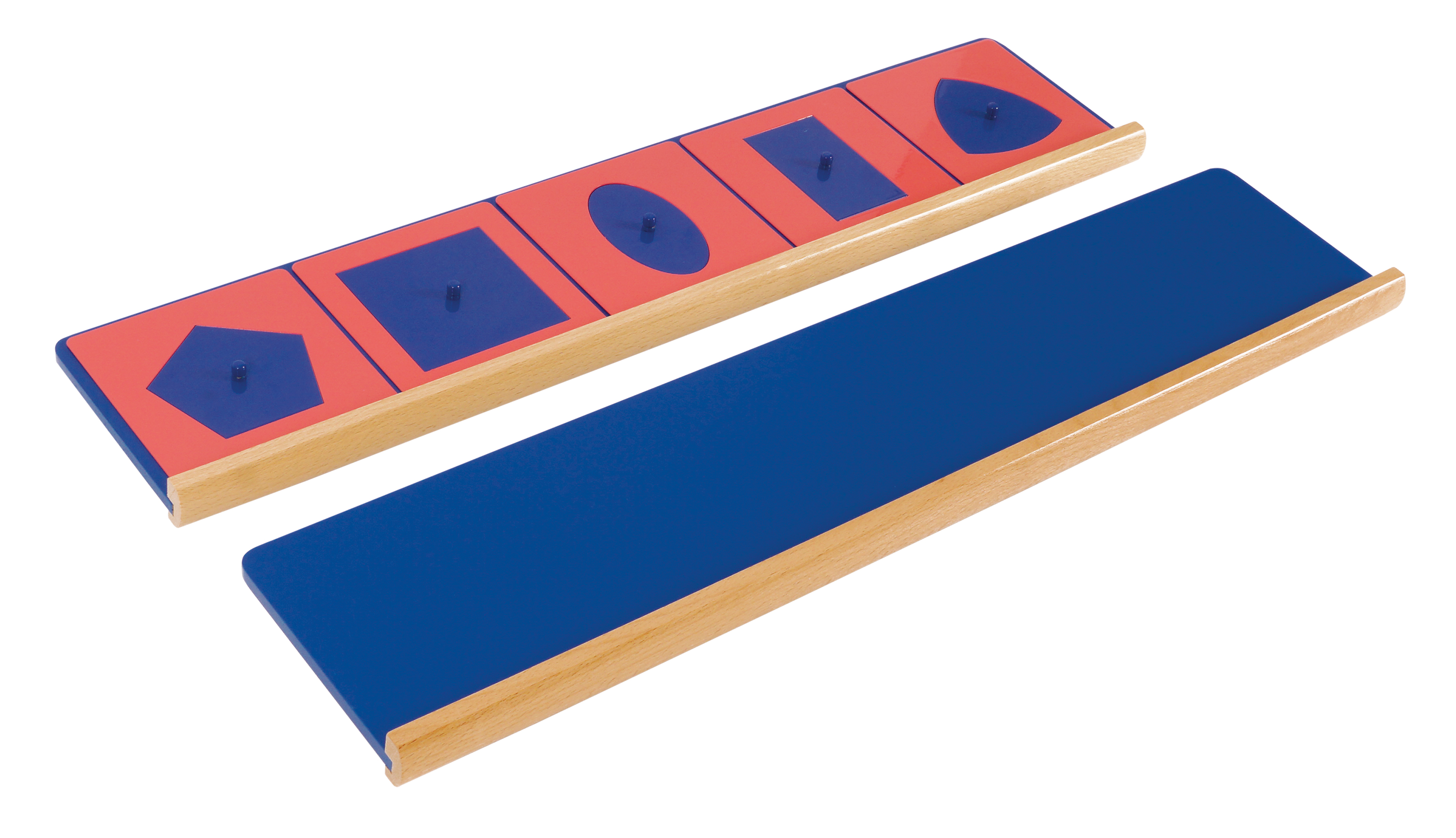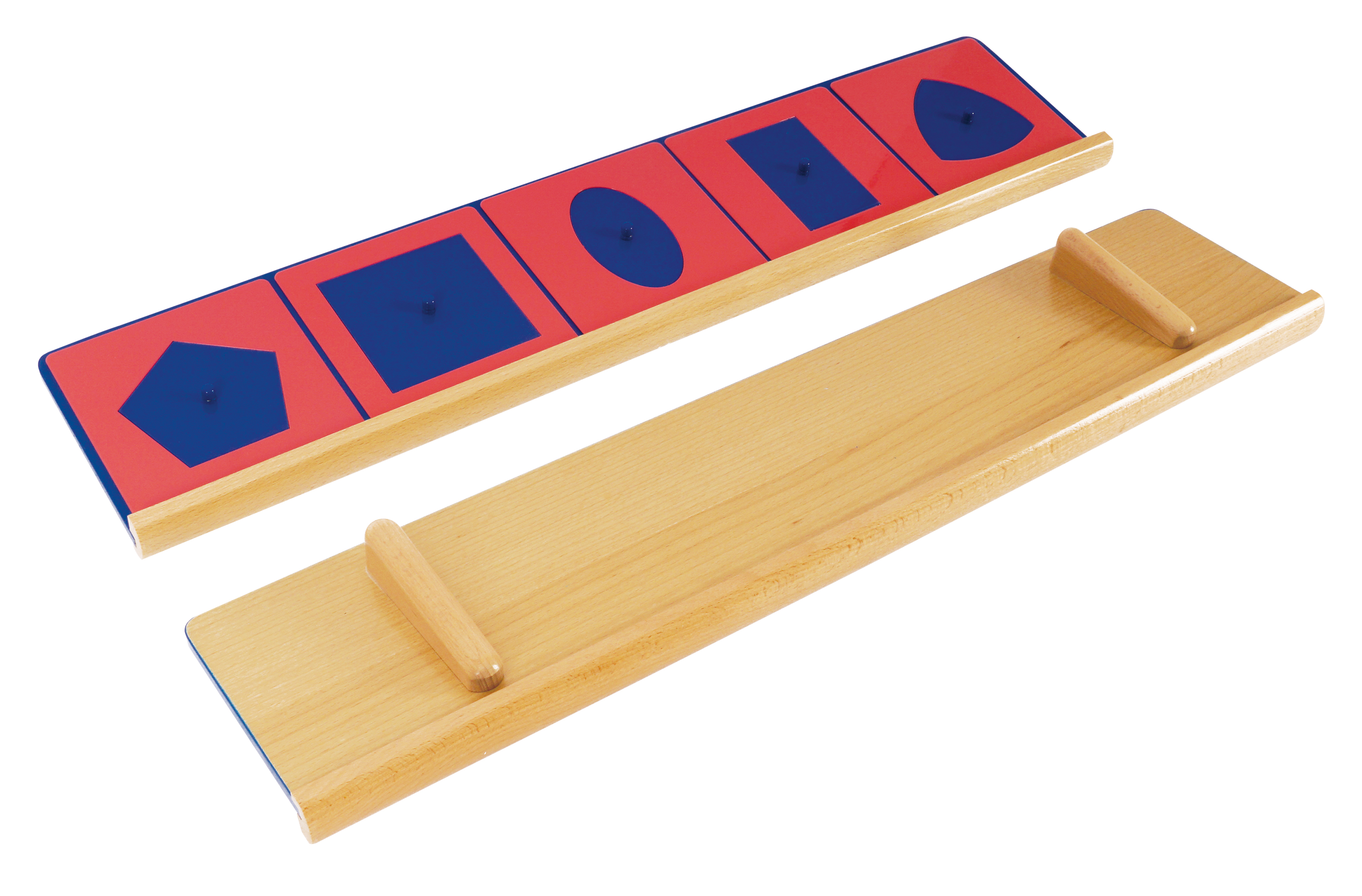 "A készlet 10 geometriai formát tartalmaz, melyek kék fém behelyezőkből készültek, mindegyik közepén egy kis megfogható gombbal, amely lehetővé teszi azok egyszerű kiemelését. A kék formákat rózsaszín keretek veszik körül, melyek külső szegélye négyzet alakú, míg belső szegélyük a geometriai alakzat negatívját alkotja.