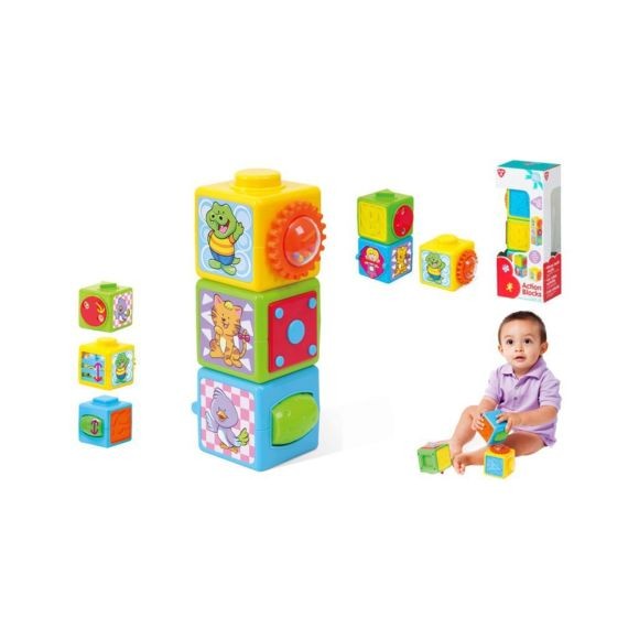 Tartalma: 3 darab egymásba helyezhető kocka Termék mérete: 3 darab 8x8x8 cm-es kocka Csomagolás mérete: 11x8x28 cm 12 hónapos korú gyermekek használatára CE minősítéssel ellátva!