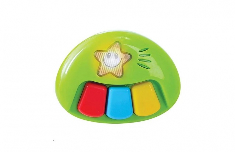 Az élénk színei miatt ez a hangszer biztosan nagy kedvence lesz a kisgyerekeknek, ráadásul a három színes billentyű segítségével mókás dallamokat csalogathatnak elő a játékból, és a díszítésként szolgáló vidám kis csillag is villogással deríti jobb kedvre a gyerekeket. A játék működéséhez 2 db 1,5V AA ceruzaelemre van szükség. 12 hónapos korú gyermekek használatára CE minősítéssel ellátva!