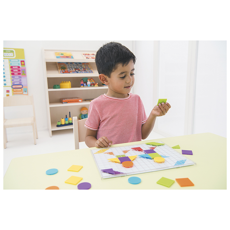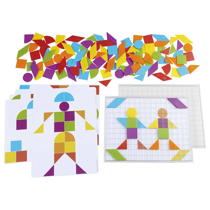 A doboz tartalma: 6 db kétoldalas foglalkoztató tábla (összesen 12 modell, 27x20 cm), 2 db átlátszó műanyag rács (27,4x21 cm), valamint 120 db műanyag mozaikelem 6 különböző formában és 6 színben (háromszög, négyzet, negyedkör, paralelogramma – oldaluk 3,3 cm; korong átmérője 3,3 cm). Erős, tartós anyagból készült, könnyen tisztítható, ideális intézményi használatra és hosszú távú fejlesztő tevékenységekhez.