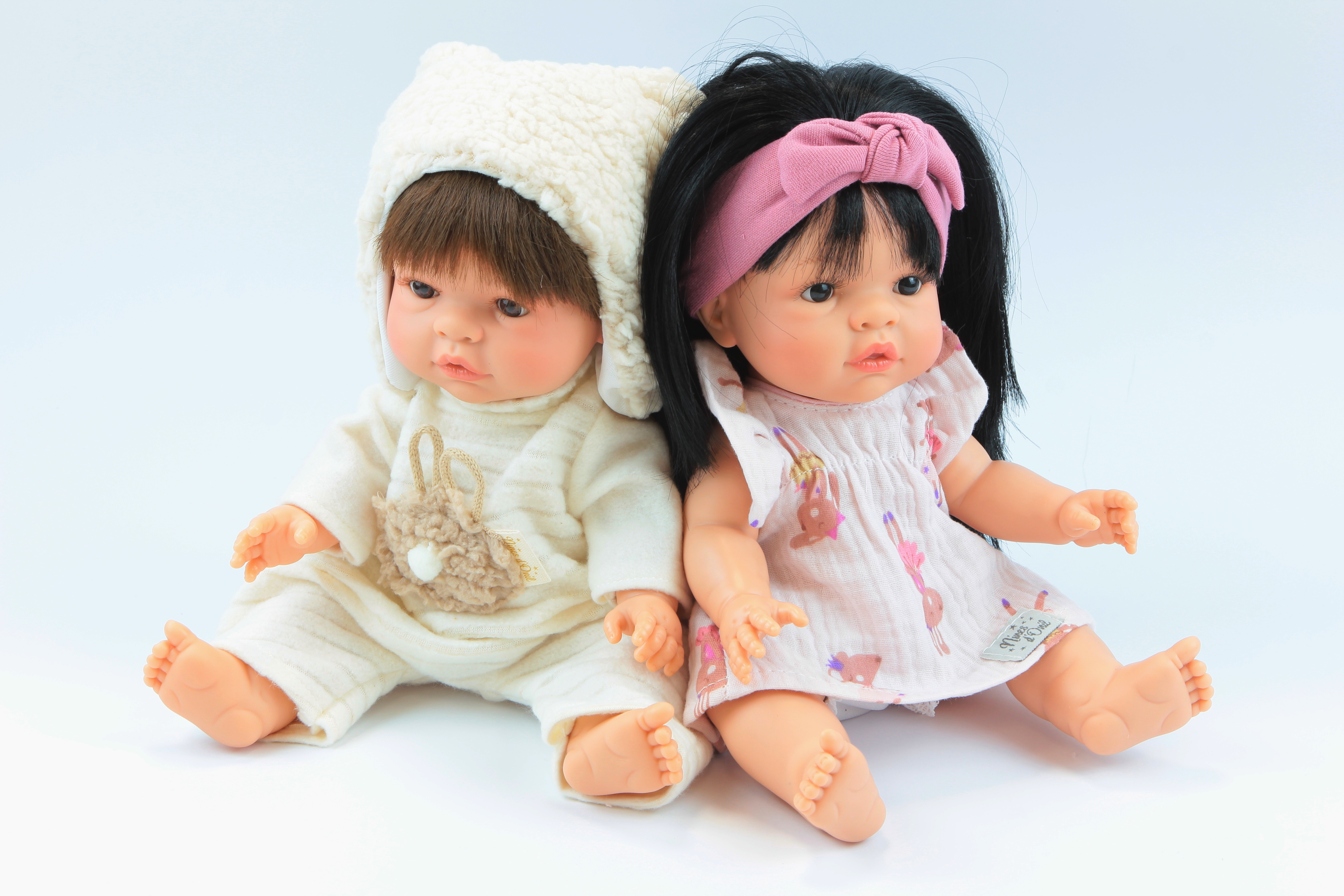 Mérete: 37 cm A Nines babái mind magas minőségű, kimondottan pontos és élethű kivitelezésű játékok. A lány, hajas baba picike rózsaszín ruhácskában érkezik, apró kisállat mintával. A baba fején sötétebb rózsaszín fejpánt található. Ruházata és nemi jellege erősíti a kislányos megjelenést. Teste kellemes tapintású, illatos műanyagból készült, hosszú haja fekete színű, copfba fogható. A baba szeme nem csukódik, azonban tekintete kedvességet sugároz. A valósághoz hű külsőt a pirospozsgás arca, pici rózsaszín szája és mozgatható végtagjai adják. Ennek köszönhetően a baba ülni és feküdni is tud. Anyagából kifolyólag a baba fürdethető. 24 hónapos korú gyermekek részére CE minősítéssel ellátva! Származási helye: Spanyolország