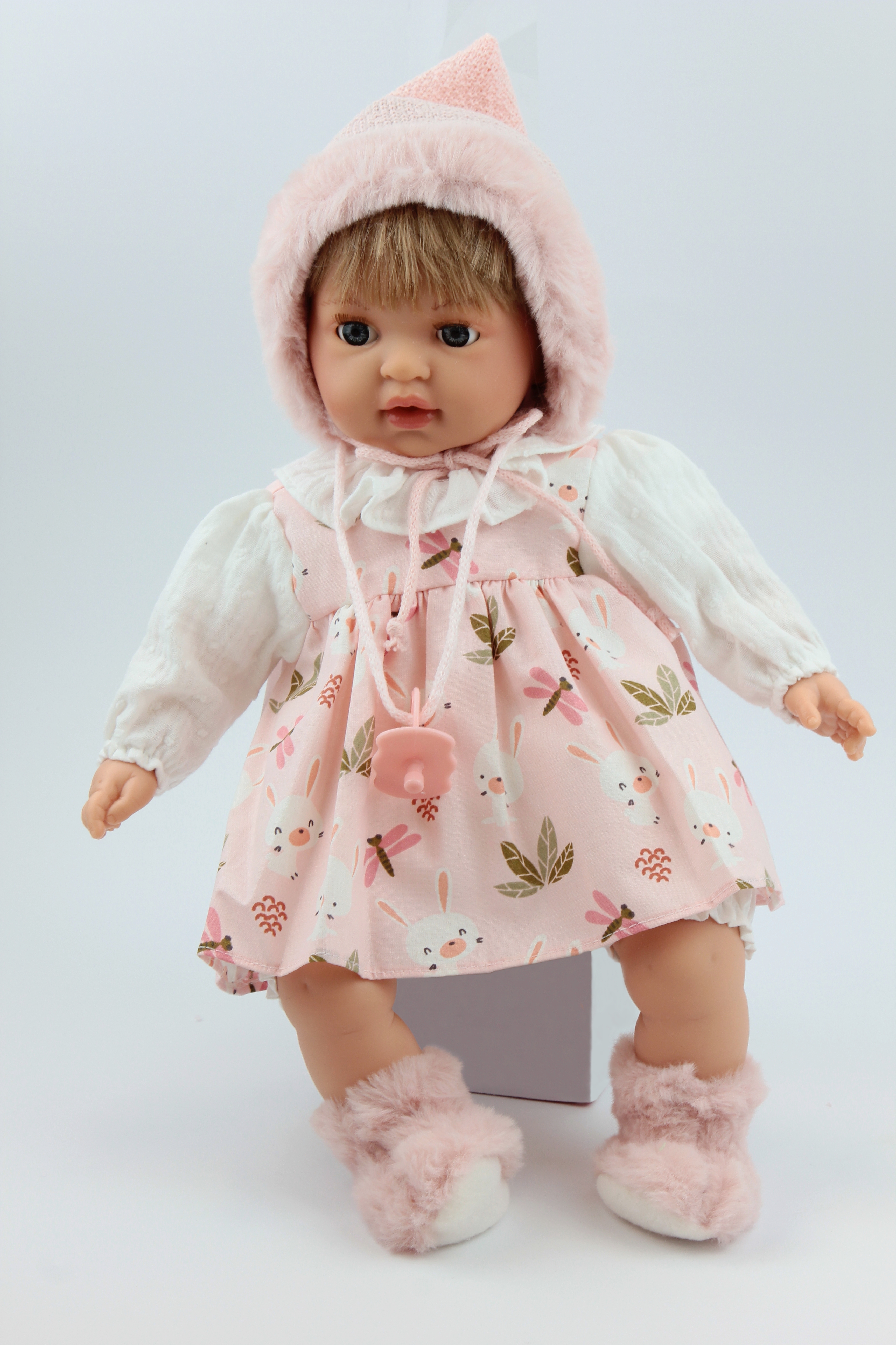 Mérete: 40 cm A Nines babái mind magas minőségű, kimondottan pontos és élethű kivitelezésű játékok. A Panni baba egy halván rózsaszín-fehér ruhácskában érkezik, bájos állatokat és növényt ábrázoló mintákkal. A hajas baba fején halványrózsaszín, szörmés, megkötős sapkácska van. Nyakában egy szintén halvány rózsaszínű cumi lóg, ami a szájába is illeszkedik. Feje és végtagjai kellemes tapintású, illatos műanyagból készültek, teste puha textil anyag. A baba szeme csukódik, tekintete kedvességet sugároz. Pici rózsaszín szája és pirospozsgás arca igazán élethűvé varázsolja a játékot. 24 hónapos korú gyermekek részére CE minősítéssel ellátva! Származási helye: Spanyolország