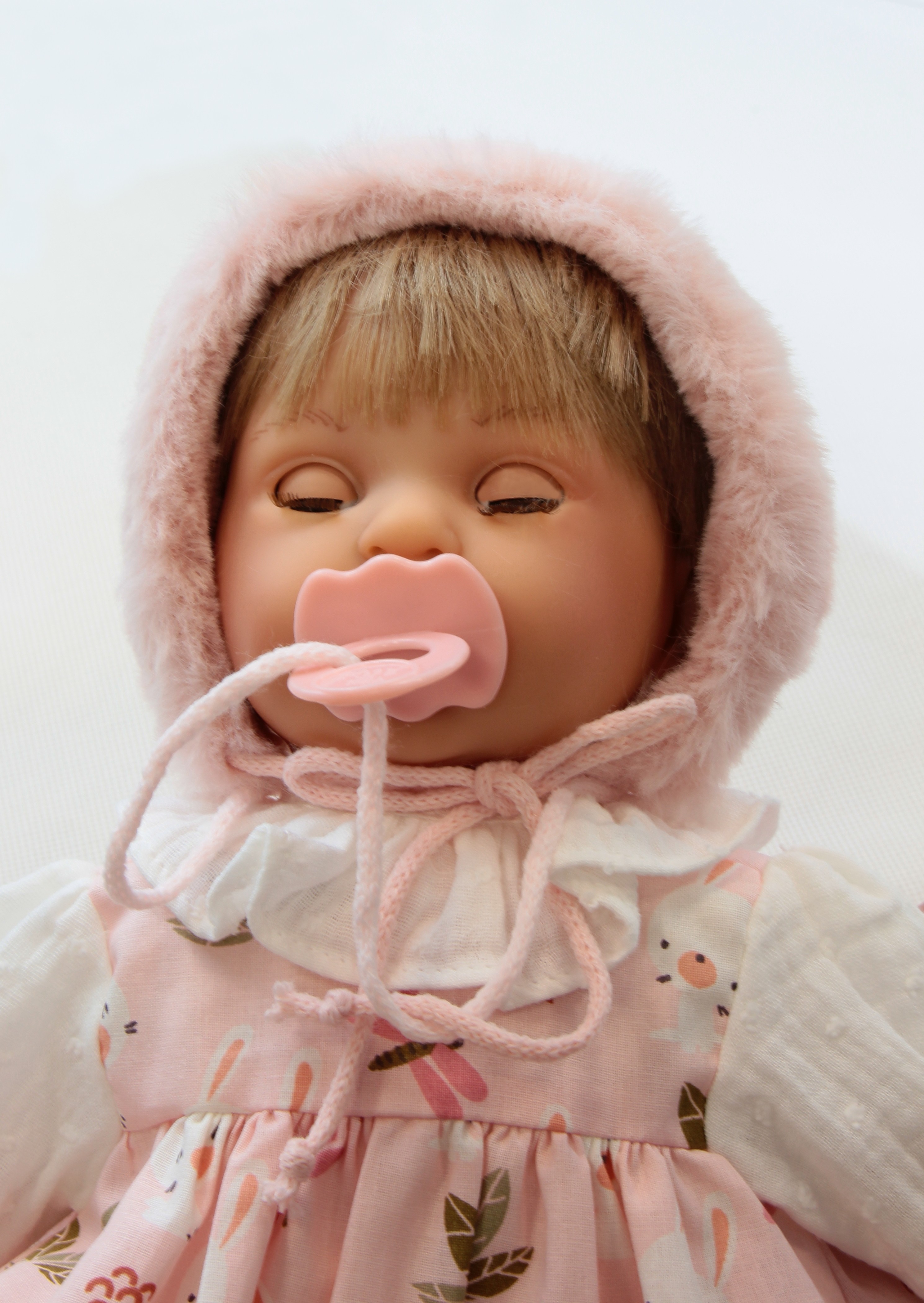 Nyakában egy szintén halvány rózsaszínű cumi lóg, ami a szájába is illeszkedik.
