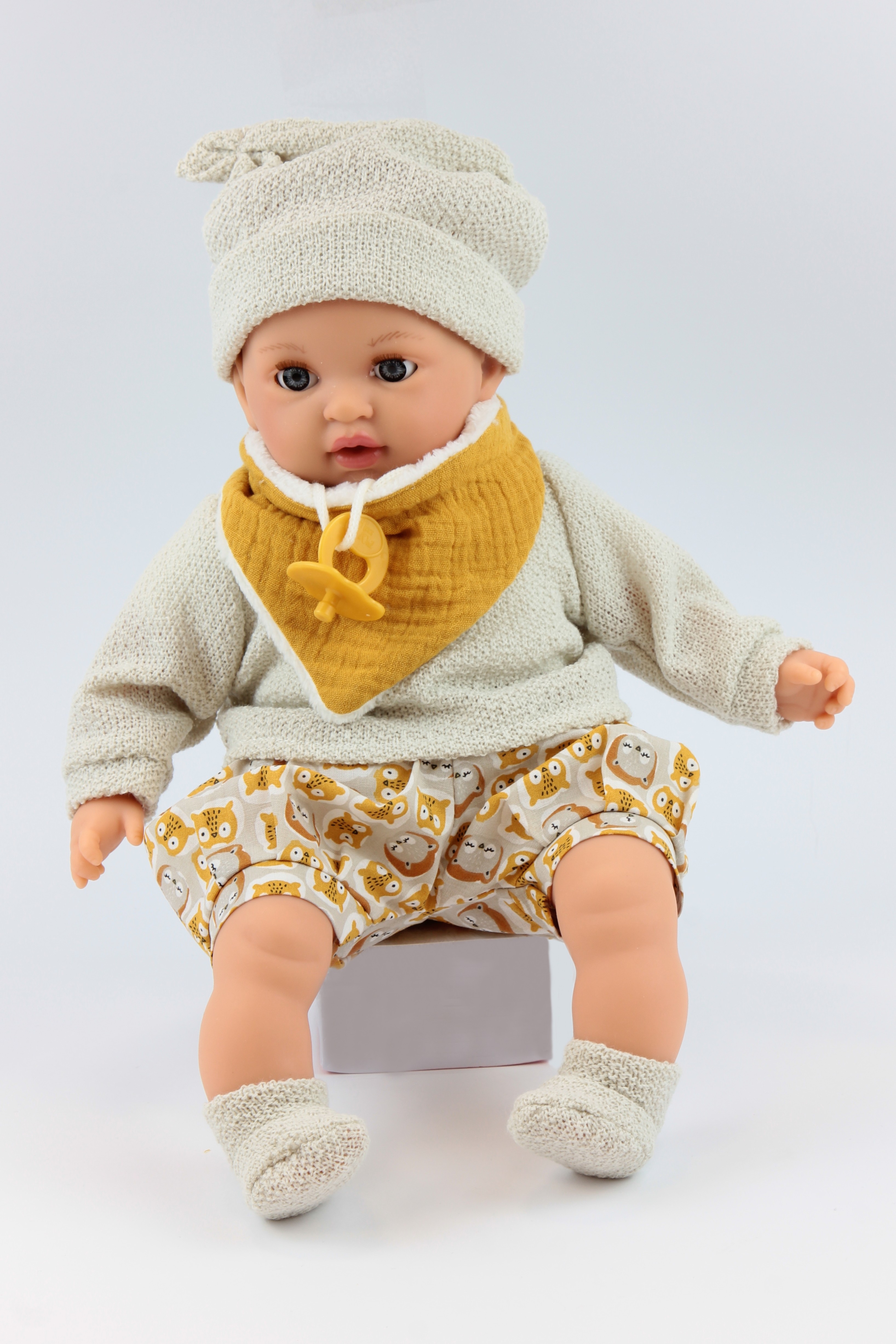 Mérete: 40 cm A NINES Peti babájának teste puha textil anyagú, feje és végtagjai kellemes tapintású műanyagból készültek. Pólója, hálósipkája és kis zoknia bézs színű, kisnadrágja apró állatfigurás, nyakában mustársárga színű kendő van. Minden ruhadarab magasminőségű, puha textil anyagból készült. A baba nyakában egy apró cumi függ, finom fehér zsinórra fűzve. A cumit a szájába lehet tenni. A játékbaba arca barátságos, nagy kék pislogó szemei, visszafogott festett, barna szemöldöke és pirosas arcpírja igazán élethű külsőt kölcsönöz neki. 24 hónapos korú gyermekek részére CE minősítéssel ellátva! Származási helye: Spanyolország Súly: 380 g