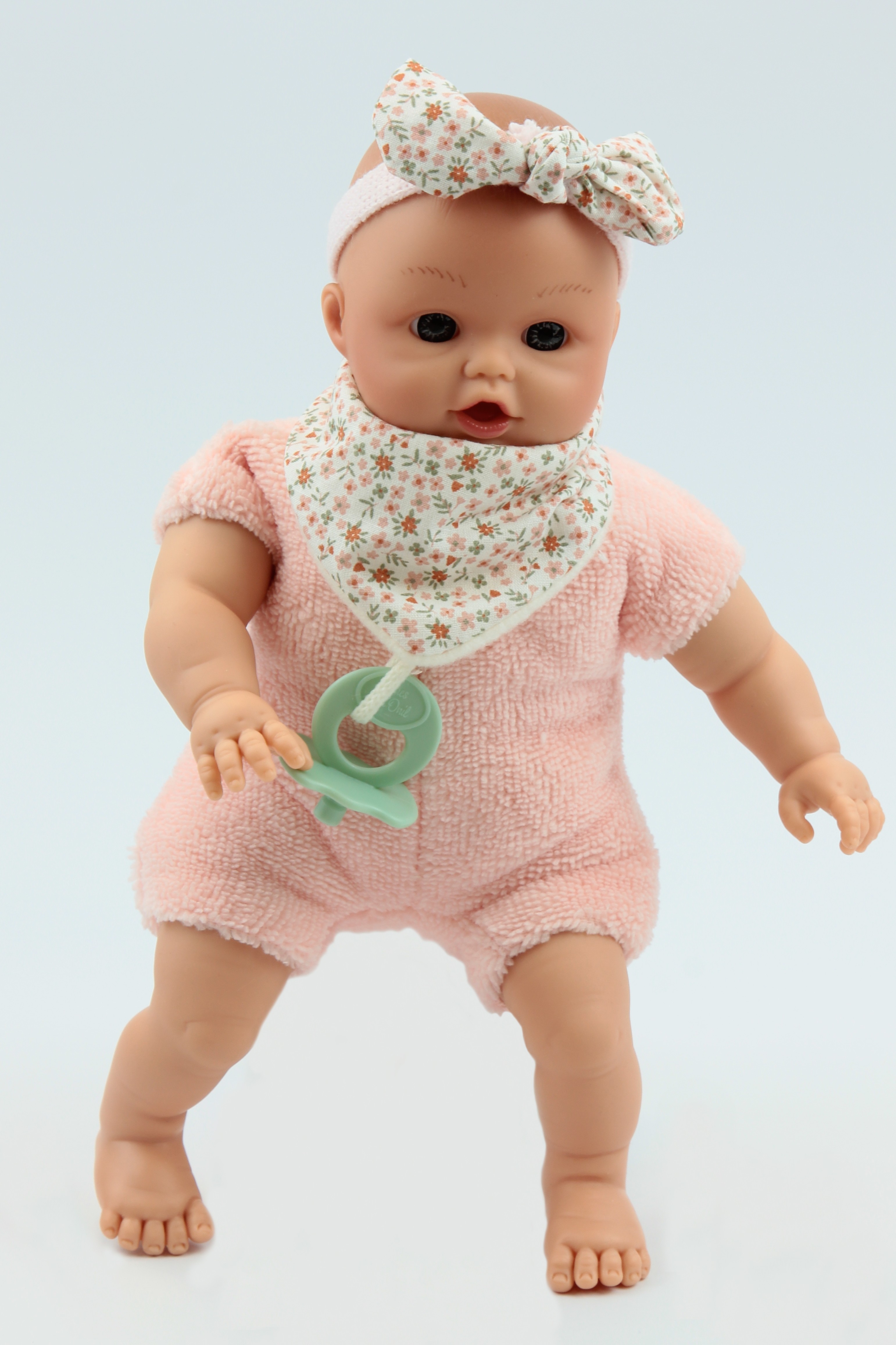 Mérete: 26 cm A Nines babái mind magas minőségű, kimondottan pontos és élethű kivitelezésű játékok. A csecsemő baba picike rózsaszín pizsamában érkezik, apró menta színű cumival a nyakában. A cumi nem illeszkedik a baba szájába! A baba nyakában fehér alapon apró virágos sál, fején rózsaszínű és apró virágmintás fejpánt található. Feje és végtagjai kellemes tapintású, illatos műanyagból készültek, teste puha textil anyag. A baba szeme nem csukódik, azonban tekintete kedvességet sugároz. Pici rózsaszín szája és pirospozsgás arca igazán élethűvé varázsolja a játékot. 24 hónapos korú gyermekek részére CE minősítéssel ellátva! Származási helye: Spanyolország