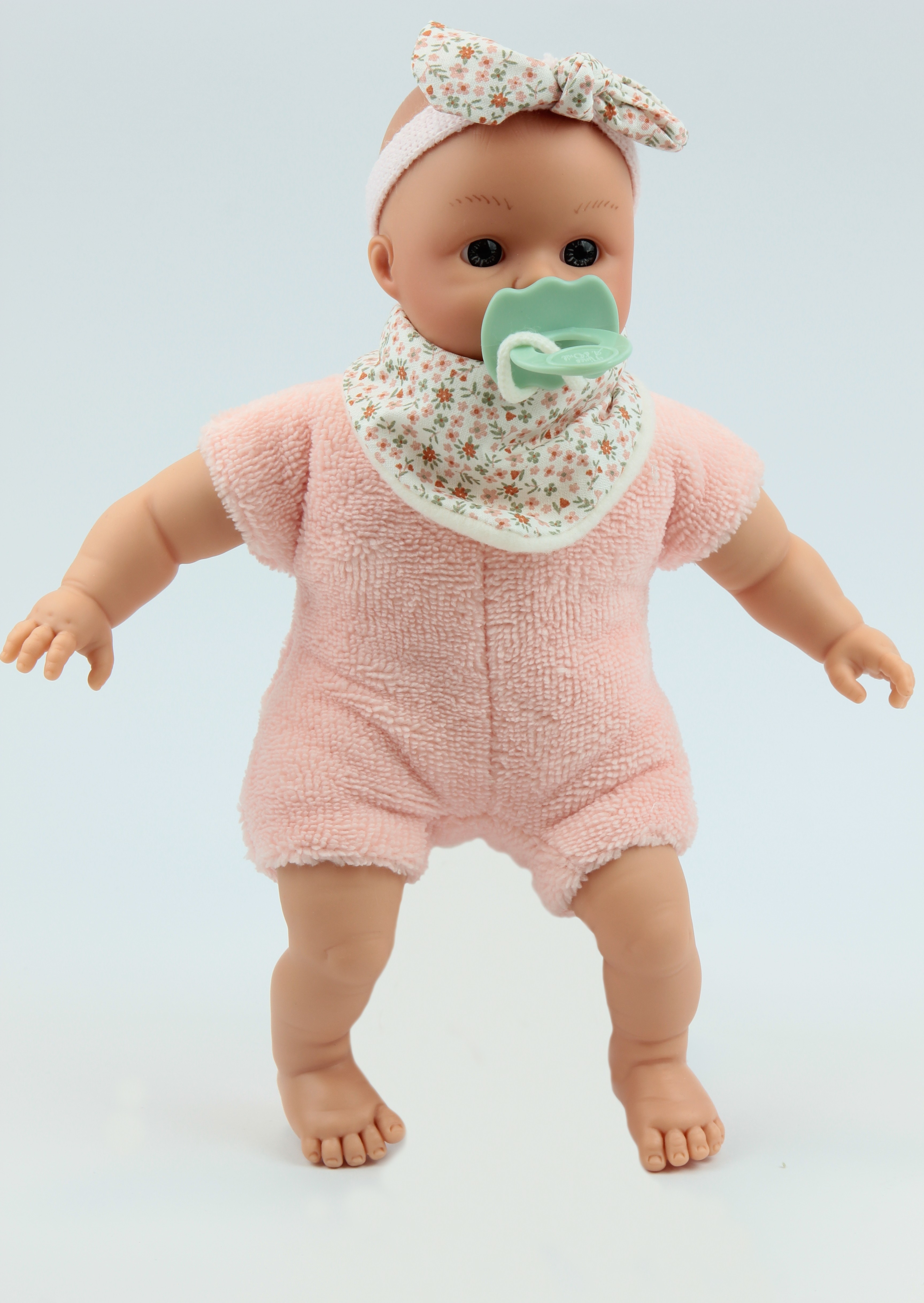 A csecsemő baba picike rózsaszín pizsamában érkezik, apró menta színű cumival a nyakában. A cumi nem illeszkedik a baba szájába!