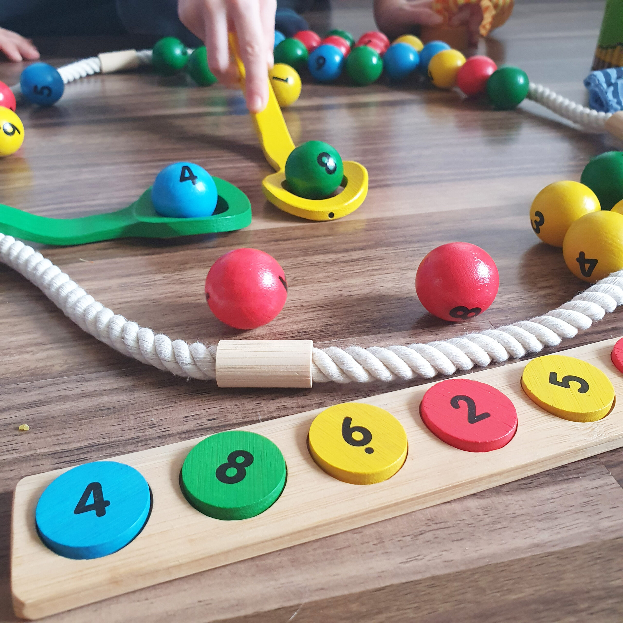 • A színes fa korongokat tetszőleges szín, vagy szín és szám sorrendben (ha már a gyermekek ismerik a számképeket) helyezzük a kis fa tartó bemélyedéseibe. Nem szükséges mind a 10 korong helyet felhasználni, játszhatunk kevesebb színkombinációval is.