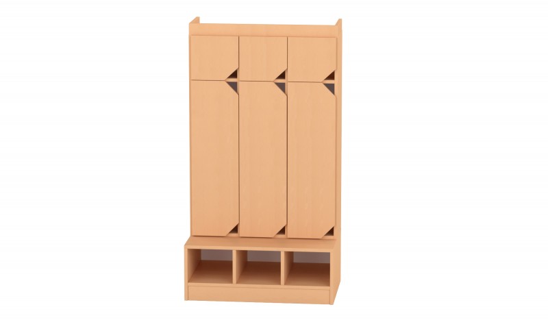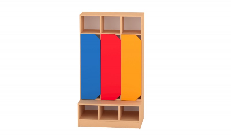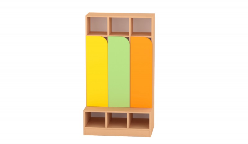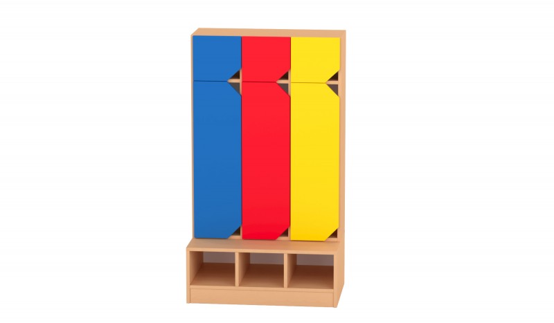 A 3 fős gyermeköltöző praktikus és jól átlátható megoldást kínál óvodai és bölcsődei környezetben. A nyitott kialakítás és az alsó polcos cipőtároló megkönnyíti a mindennapi öltözést és a rend fenntartását. A bútorhoz külön rendelhetők alsó és felső ajtók, natúr vagy színes kivitelben, amelyek segítenek elrejteni a ruhákat és személyes tárgyakat. A tetejére opcionálisan leesésgátló–jeltartó is elhelyezhető, amely további pakolófelületet biztosít.