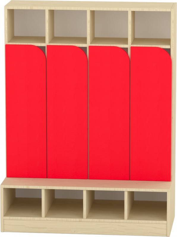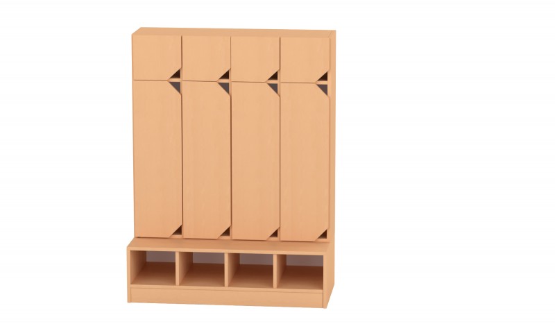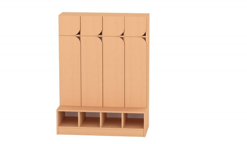 A 4 fős gyermeköltöző praktikus és jól átlátható megoldást kínál óvodai és bölcsődei környezetben. A nyitott kialakítás és az alsó polcos cipőtároló megkönnyíti a mindennapi öltözést és a rend fenntartását. A felső polcos rész és az akasztók elkülönített helyet biztosítanak a ruhák és személyes tárgyak számára. A bútorhoz külön rendelhetők alsó és felső ajtók, natúr vagy színes kivitelben, valamint a tetejére opcionálisan leesésgátló–jeltartó is elhelyezhető.