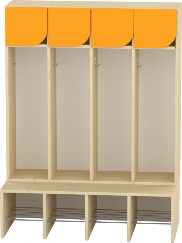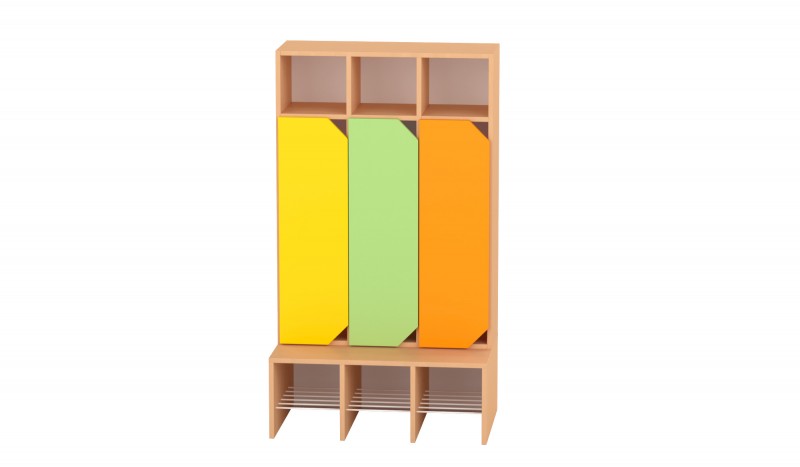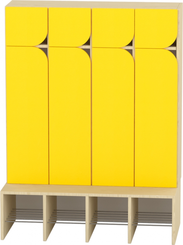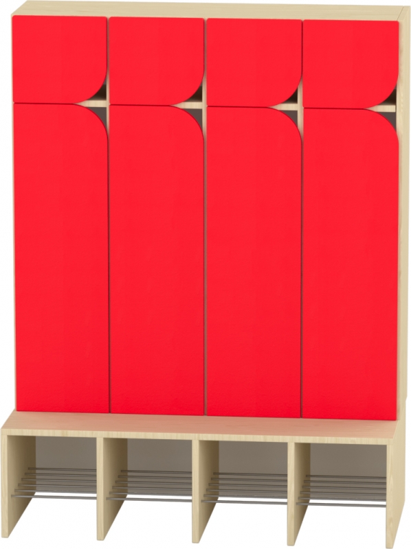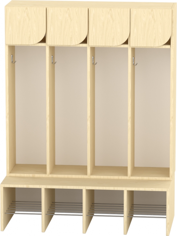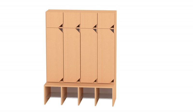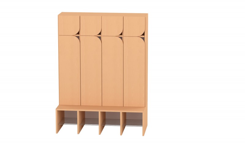 A 4 fős gyermeköltöző rácsos cipőtartóval jól szellőző és praktikus megoldást kínál óvodai és bölcsődei környezetben. A nyitott kialakítás segíti a gyermekek önálló öltözését, míg az alsó rácsos cipőtartó elősegíti a cipők gyors száradását és megfelelő szellőzését. A felső polcos rész és az akasztók elkülönített tárolóhelyet biztosítanak a ruhák és személyes tárgyak számára. A bútorhoz külön rendelhetők alsó és felső ajtók, natúr vagy színes kivitelben, valamint a tetejére opcionálisan leesésgátló–jeltartó is elhelyezhető.