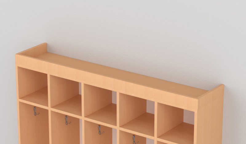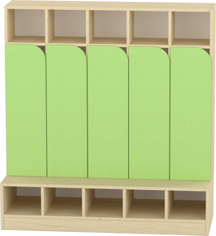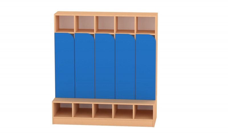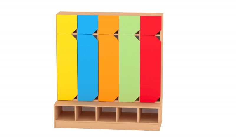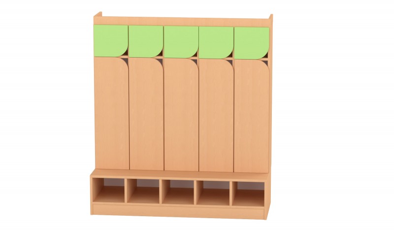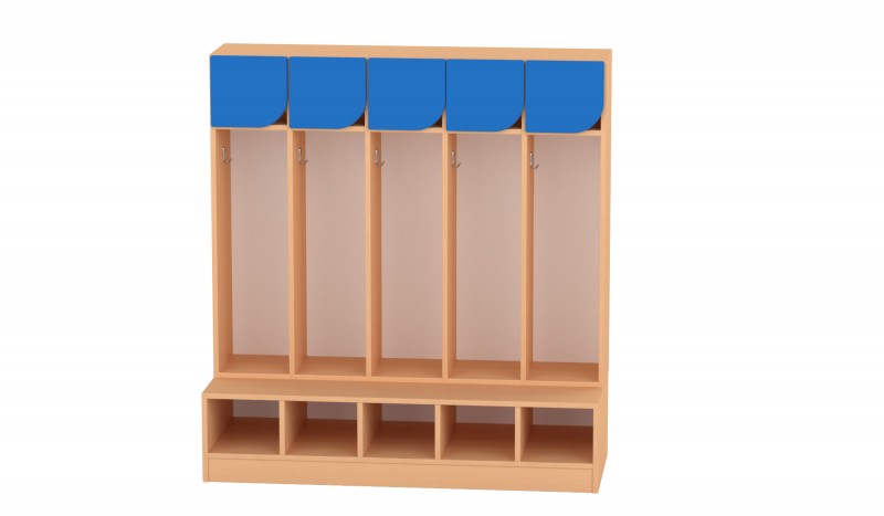 Az 5 fős gyermeköltöző praktikus és jól átlátható megoldást biztosít óvodai és bölcsődei környezetben. A nyitott kialakítás és az alsó polcos cipőtároló segíti a mindennapi öltözést és a rendezett tárolást. A felső polcos rész és az akasztók elkülönített helyet biztosítanak a ruhák és személyes tárgyak számára. A bútorhoz külön rendelhetők alsó és felső ajtók, natúr vagy színes kivitelben, valamint a tetejére opcionálisan leesésgátló–jeltartó is elhelyezhető.