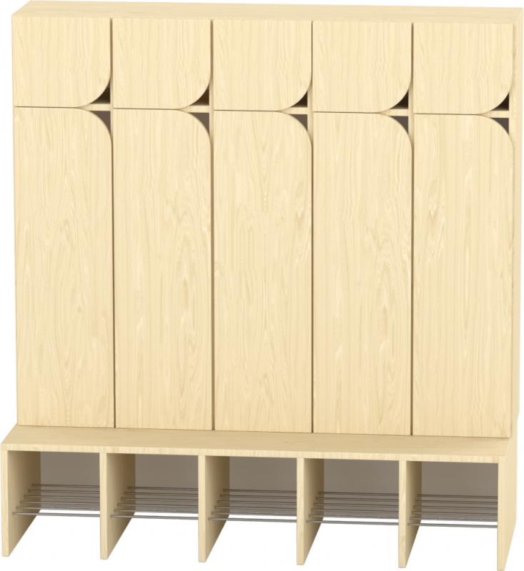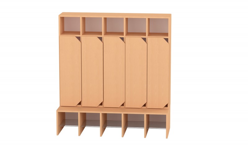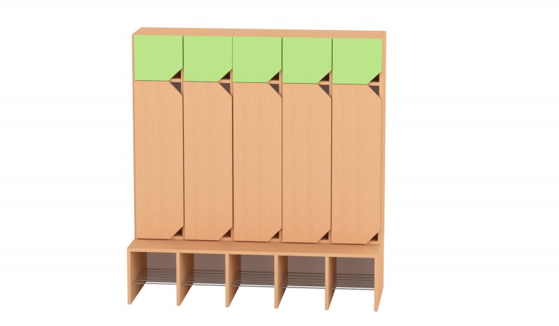 Az 5 fős gyermeköltöző rácsos cipőtartóval praktikus és jól szellőző megoldást kínál óvodai és bölcsődei környezetben. A nyitott kialakítás segíti a gyermekek önálló öltözését, míg az alsó rácsos cipőtartó elősegíti a cipők megfelelő szellőzését és gyorsabb száradását. A felső polcos rész és az akasztók elkülönített tárolóhelyet biztosítanak a ruhák és személyes tárgyak számára. A bútorhoz külön rendelhetők alsó és felső ajtók, natúr vagy színes kivitelben, valamint a tetejére opcionálisan leesésgátló–jeltartó is elhelyezhető.