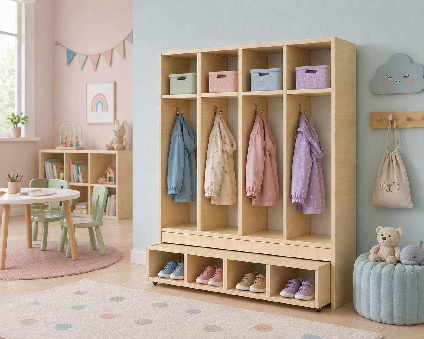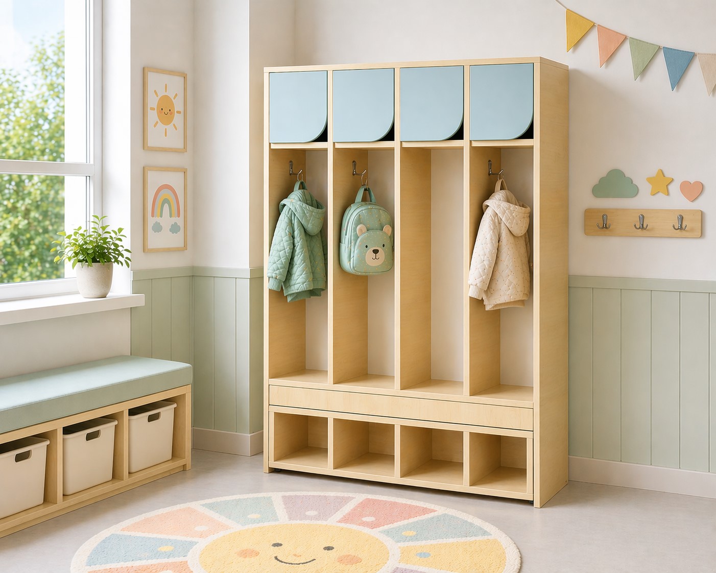 kihúzható ülőpad lehetővé teszi, hogy öltözéskor több gyermek is kényelmesen helyet foglaljon, majd használat után egyszerűen