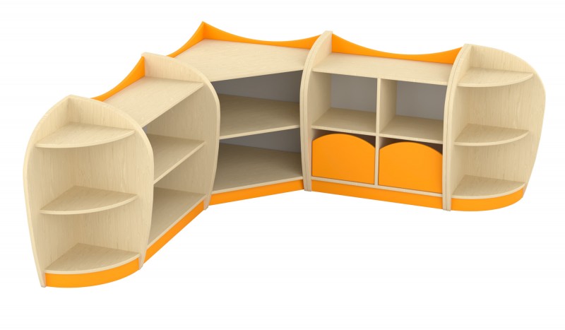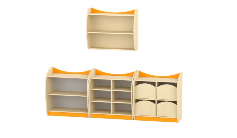 Íves kisszekrény, polcos, nyitott A bútor jellegzetessége a lágyan ívelt, szélesebb oldalelem, amelynek köszönhetően a polc kissé beljebb kerül, stabil és biztonságos elrendezést biztosítva. A felsőíves színes betét és az alsó, hozzá illő lábazat modern, barátságos megjelenést ad. A teljes konstrukció lekerekített élei és íves sarokkialakítása biztonságos választássá teszik bölcsődés és óvodás környezetbe egyaránt. A bútor 1 polcos és két tárolószinttel rendelkezik. A túlnyúló, felsőperemes kialakításnak köszönhetően a kisszekrény teteje is pakolható, semmi nem esik le róla. Szín: juhar-narancs