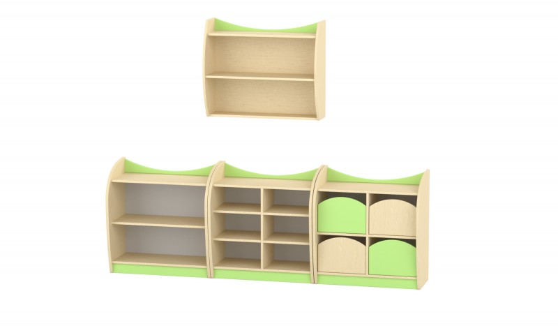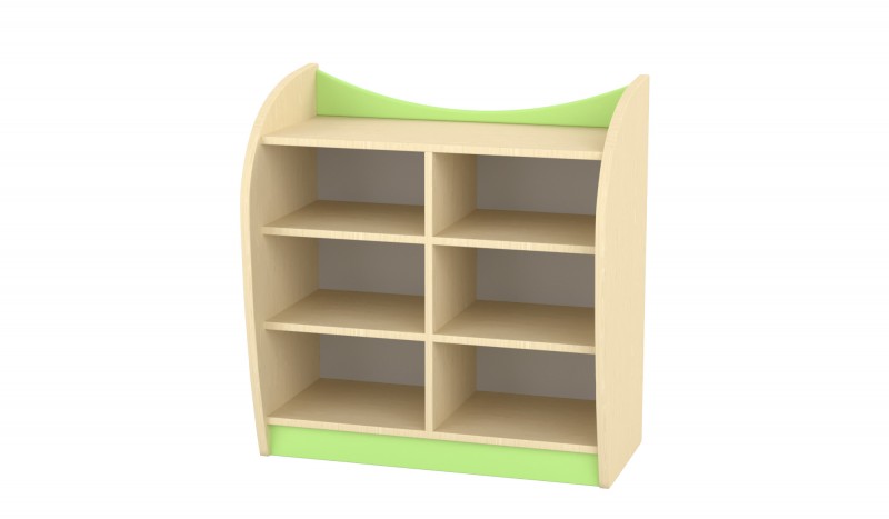Íves kisszekrény - 6 fakkos, nyitott A bútor jellegzetessége a lágyan ívelt, szélesebb oldalelem, amelynek köszönhetően a polc kissé beljebb kerül, stabil és biztonságos elrendezést biztosítva. A felsőíves színes betét és az alsó, hozzá illő lábazat modern, barátságos megjelenést ad. A teljes konstrukció lekerekített élei és íves sarokkialakítása biztonságos választássá teszik bölcsődés és óvodás környezetbe egyaránt. A bútor nyitott, 6 fakkos. A túlnyúló, felsőperemes kialakításnak köszönhetően a kisszekrény teteje is pakolható, semmi nem esik le róla. Szín: juhar-zöld