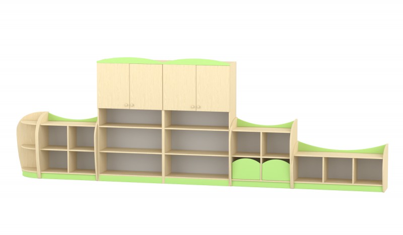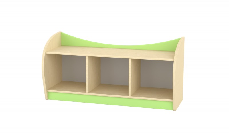 Íves alacsony szekrény - 3 fakkos A bútor jellegzetessége a lágyan ívelt, szélesebb oldalelem, amelynek köszönhetően a polc kissé beljebb kerül, stabil és biztonságos elrendezést biztosítva. A felsőíves színes betét és az alsó, hozzá illő lábazat modern, barátságos megjelenést ad. A teljes konstrukció lekerekített élei és íves sarokkialakítása biztonságos választássá teszik bölcsődés és óvodás környezetbe egyaránt. A bútor nyitott, 3 fakkos. A túlnyúló, felsőperemes kialakításnak köszönhetően a kisszekrény teteje is pakolható, semmi nem esik le róla. Szín: juhar-zöld