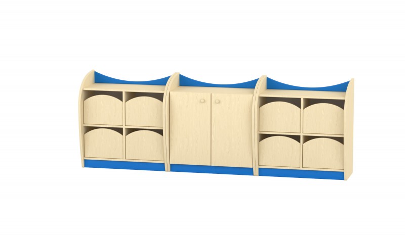 Íves kisszekrény - 4 fiókos, juhar színű fiókokkal A bútor jellegzetessége a lágyan ívelt, szélesebb oldalelem, amelynek köszönhetően a polc kissé beljebb kerül, stabil és biztonságos elrendezést biztosítva. A felsőíves színes betét és az alsó, hozzá illő lábazat modern, barátságos megjelenést ad. A teljes konstrukció lekerekített élei és íves sarokkialakítása biztonságos választássá teszik bölcsődés és óvodás környezetbe egyaránt. A bútor 4 fiókos kialakítású. A fiókok fém síneken futnak, így használatuk stabil, (a fiókok nem esnek ki) biztonságos. A túlnyúló, felsőperemes kialakításnak köszönhetően a kisszekrény teteje is pakolható, semmi nem esik le róla. Szín: juhar-kék Készreszerelt termék. Térbeállítható: Nem Mérete: 82x38x86 cm