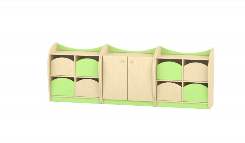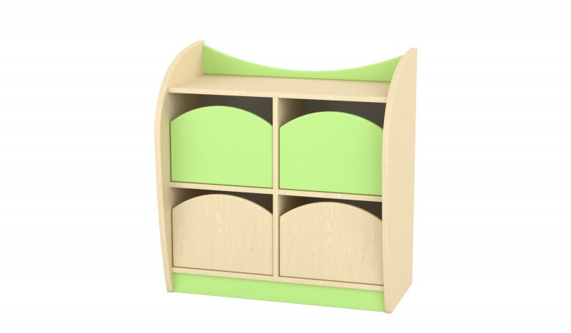 Íves kisszekrény - 4 fiókos A bútor jellegzetessége a lágyan ívelt, szélesebb oldalelem, amelynek köszönhetően a polc kissé beljebb kerül, stabil és biztonságos elrendezést biztosítva. A felsőíves színes betét és az alsó, hozzá illő lábazat modern, barátságos megjelenést ad. A teljes konstrukció lekerekített élei és íves sarokkialakítása biztonságos választássá teszik bölcsődés és óvodás környezetbe egyaránt. A bútor 4 fiókos kialakítású. A fiókok fém síneken futnak, így használatuk stabil, (a fiókok nem esnek ki) biztonságos. A túlnyúló, felsőperemes kialakításnak köszönhetően a kisszekrény teteje is pakolható, semmi nem esik le róla. Szín: juhar-zöld