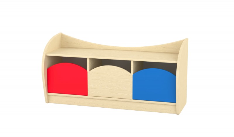 Íves alacsony szekrény, 3 fiókkal - juhar, vegyes színű fiókokkal, A bútor jellegzetessége a lágyan ívelt, szélesebb oldalelem, amelynek köszönhetően a polc kissé beljebb kerül, stabil és biztonságos elrendezést biztosítva. A felsőíves színes betét és az alsó, hozzá illő lábazat modern, barátságos megjelenést ad. A teljes konstrukció lekerekített élei és íves sarokkialakítása biztonságos választássá teszik bölcsődés és óvodás környezetbe egyaránt. A bútor 3 fiókos kialakítású. A fiókok fém síneken futnak, így használatuk stabil, (a fiókok nem esnek ki) biztonságos. A túlnyúló, felsőperemes kialakításnak köszönhetően a kisszekrény teteje is pakolható, semmi nem esik le róla. Szín: juhar