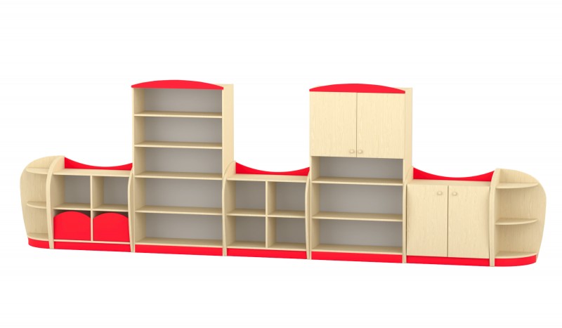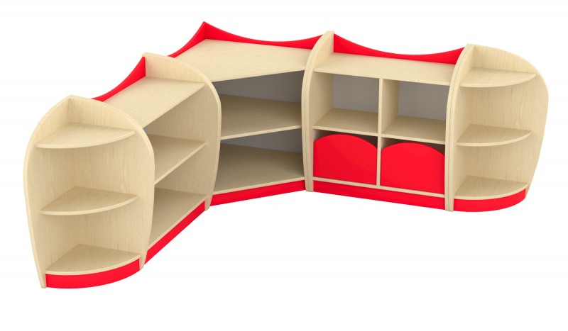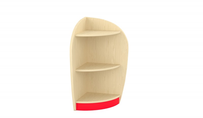 Íves elem A sarokelem három praktikus tárolószinttel rendelkezik, melyek íves oldallapjai nemcsak dekoratív megjelenést biztosítanak, hanem biztonságos használatot is a bölcsődei és óvodai környezetben. A precíz illeszkedésnek köszönhetően tökéletesen kapcsolódik a bútorcsalád további elemeihez. A felsőíves kialakítás megakadályozza, hogy a polc tetejéről bármi leguruljon, így biztonságos tárolófelületet kínál. Kompakt mérete és esztétikus formája ideális sarokba helyezhető megoldást nyújt a mindennapi használat során. Szín: juhar-piros