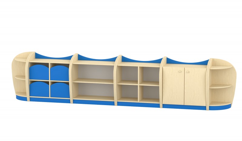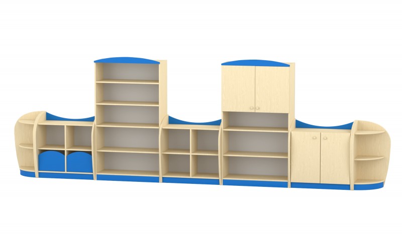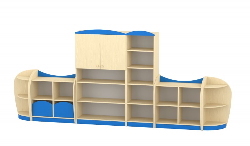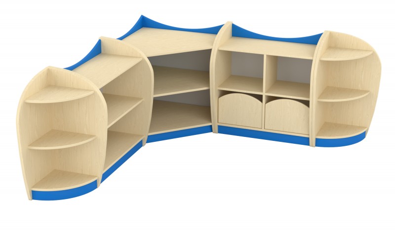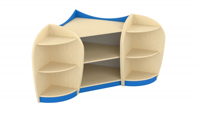 Íves elem A sarokelem három praktikus tárolószinttel rendelkezik, melyek íves oldallapjai nemcsak dekoratív megjelenést biztosítanak, hanem biztonságos használatot is a bölcsődei és óvodai környezetben. A precíz illeszkedésnek köszönhetően tökéletesen kapcsolódik a bútorcsalád további elemeihez. A felsőíves kialakítás megakadályozza, hogy a polc tetejéről bármi leguruljon, így biztonságos tárolófelületet kínál. Kompakt mérete és esztétikus formája ideális sarokba helyezhető megoldást nyújt a mindennapi használat során. Szín: juhar-kék Készreszerelt termék. Térbeállítható: Nem Mérete: 44x44x86 cm