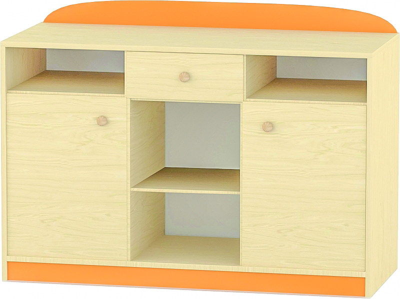 2 ajtós, 1 fiókos, polcos tálalószekrény Kialakítás: 2 ajtós, 1 fiókos, nyitott polcos résszel, 12 cm magas, narancs színű díszítőelemmel A kialakítás az óvodai és bölcsődei tálalási feladatok biztonságos és áttekinthető ellátását szolgálja. Felhasználás: óvoda, bölcsőde, tálalótér, csoportszoba Szín: juhar-narancs Készreszerelt: igen Térbeállítható: nem Méret: 120x50x90 cm