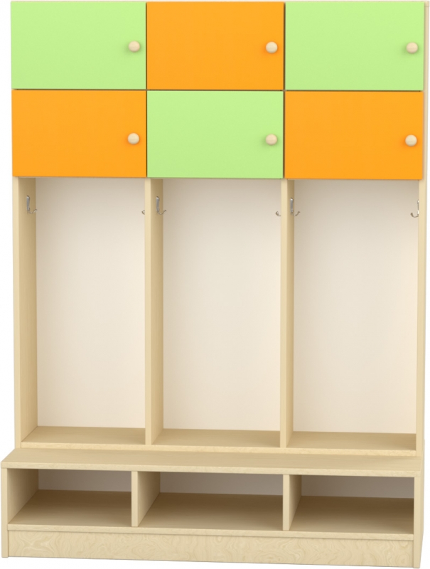 Magas gyermeköltöző 6 személyes - 3 fakkos - 6 ajtós – polcos cipőtartóval Fakkonként felül 2 ajtó van Ülésmagasság 28 cm Egy fakk szélessége 37 cm - 2 gyermek részére. Mérete: szélesség: 120 cm, magasság: 160 cm, Ülőpad mélysége: 50 cm, Felső elem mélysége: 28 cm Lekerekített ABS élzárással, A termék készreszerelt, juhar alapszínben. Szín: juhar ajtók színei: zöld-narancs