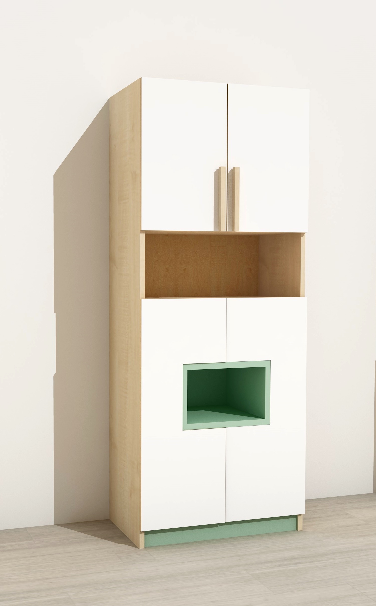 Kombinált szekrényelem, alsó és felső nyitható ajtókkal, középen nyitott polccal.Az alsó egyedi dizájnú kétajtós részbe egy nyitott dobozos betét van elhelyezve. Igényes lakkozott díszfaléc fogantyúkkal, díszítőelemekkel kombinálva. Mérete: Szélessége: 75 cm Mélysége: 40 cm Magassága: 180 cm. Az alaptest kellemes juhar, az ajtók fehér, a dobozos betét pasztellzöld színűek. Készreszerelt termék. Anyaga: laminált bútorlap lekerekített ABS élzárással, lakkozott bükkfa díszléc fogantyúval