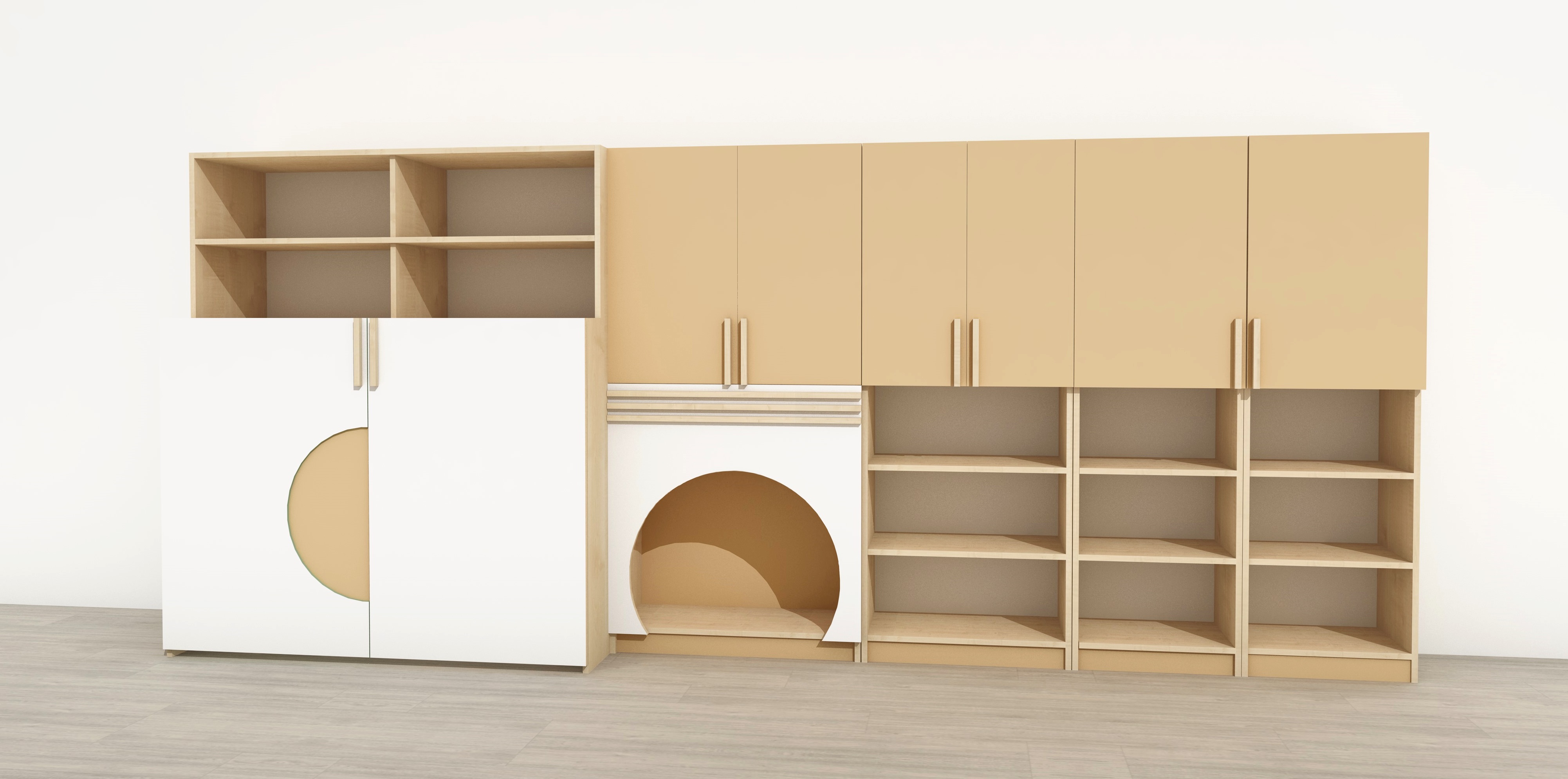 Ezek a szépen kidolgozott, saját tervezésű esztétikus szekrények díszfa léc fogantyúkkal készültek, amelyek igazán különlegessé teszik a bútort, és a csoportszobák rendezett, barátságos megjelenését támogatják. Az öt elemből álló, komplett szekrénysort az alábbi összeállításban szállítjuk: egy nagyméretű fektetőtároló szekrény 14 db bölcsődei ágyhoz, ajtós és nyitott polcos tárolóelem, valamint egy játékos, bújócskás szekrényelem amely a gyerekek kedvence lehet. A teljes szekrénysor 429 cm széles, azonban az egyes elemek külön-külön is rendelhetők, így az összeállítás rugalmasan variálható – ha nem fér el a teljes méret, bármelyik elem elhagyható. Az Ádám szekrénysort saját gyártásban készítjük, így színben, méretben és elrendezésben is igazodunk az egyedi igényekhez.