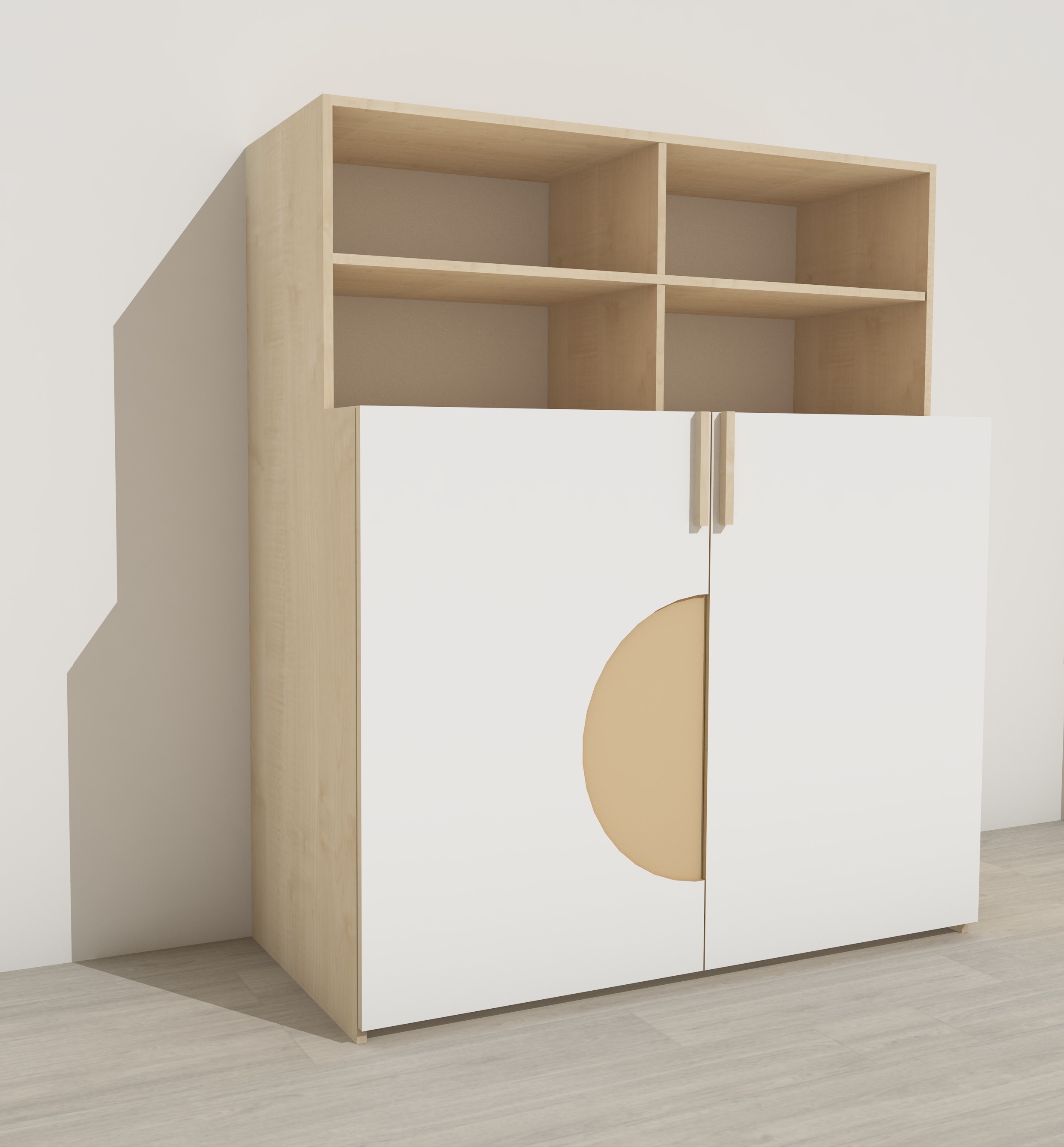 Az ágytároló bútor mérete: Szélessége: 154 cm Mélysége: ágytároló rész 65 cm, felső nyitott polcos elem 40 cm mély. Magassága: 180 cm. Színe: Az alaptest kellemes juhar, az ajtók és félköríves betét fehér és juhar szín kombinációja. Fa díszléc fogantyúval nyitható, lábazata nincs hogy az ultrakönnyű óvodai fektetőket kényelmesen belehessen gurítani. A tárolórész 120 cm magas kialakítása miatt legfeljebb 14 db ágy tárolására javasolt, így biztosítható a kényelmes ki- és bepakolás, valamint az ágyak közötti megfelelő hely az ágynemű számára is.