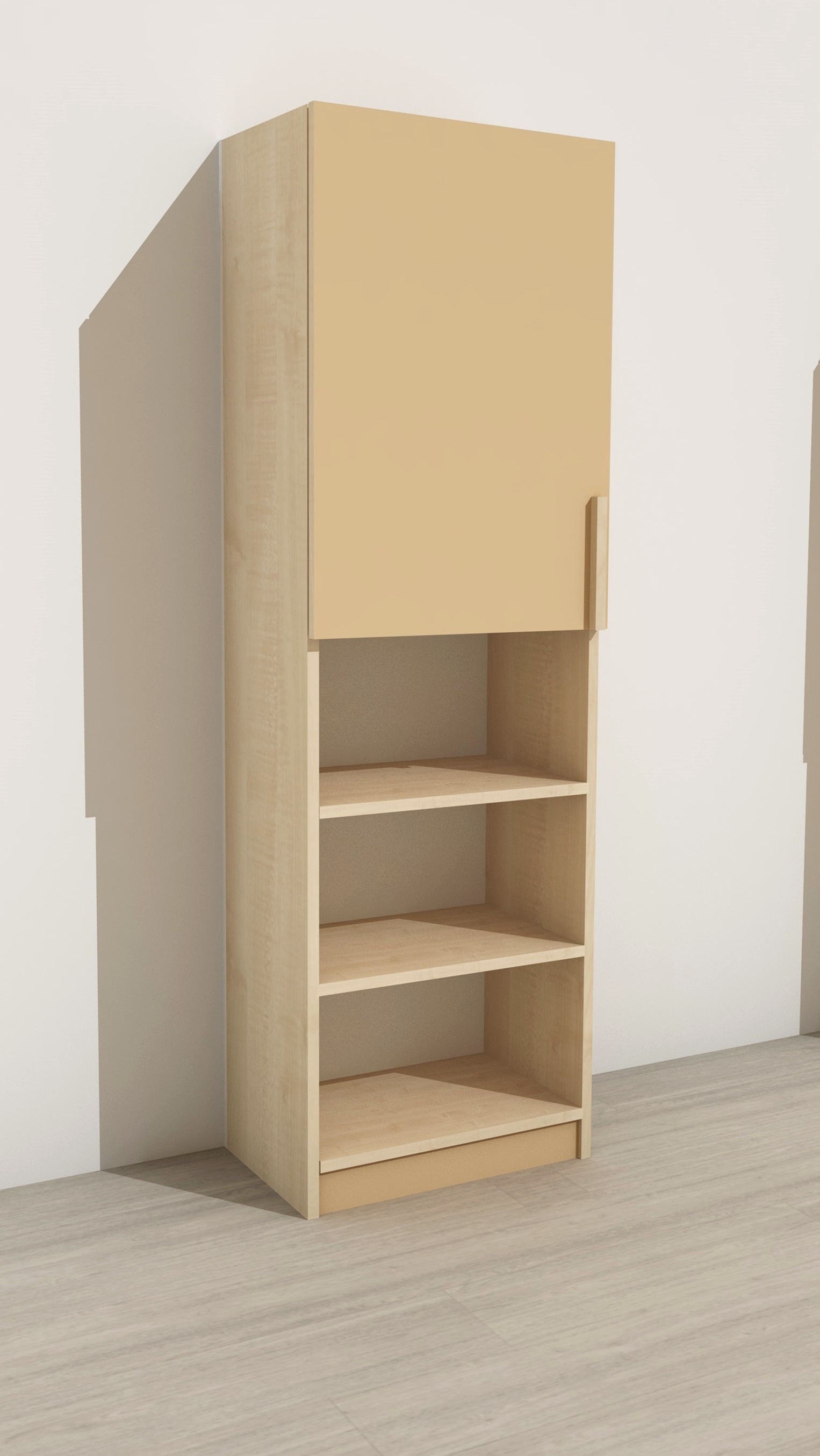 Felülajtós (balos), nyitott polcos szekrény fa díszléc fogantyúval Mérete: Szélessége: 55 cm Mélysége: 40 cm Magassága: 180 cm. Színe: juhar. Készreszerelt termék. Anyaga:laminált bútorlap lekerekített ABS élzárással, lakkozott bükkfa díszléc fogantyúval.