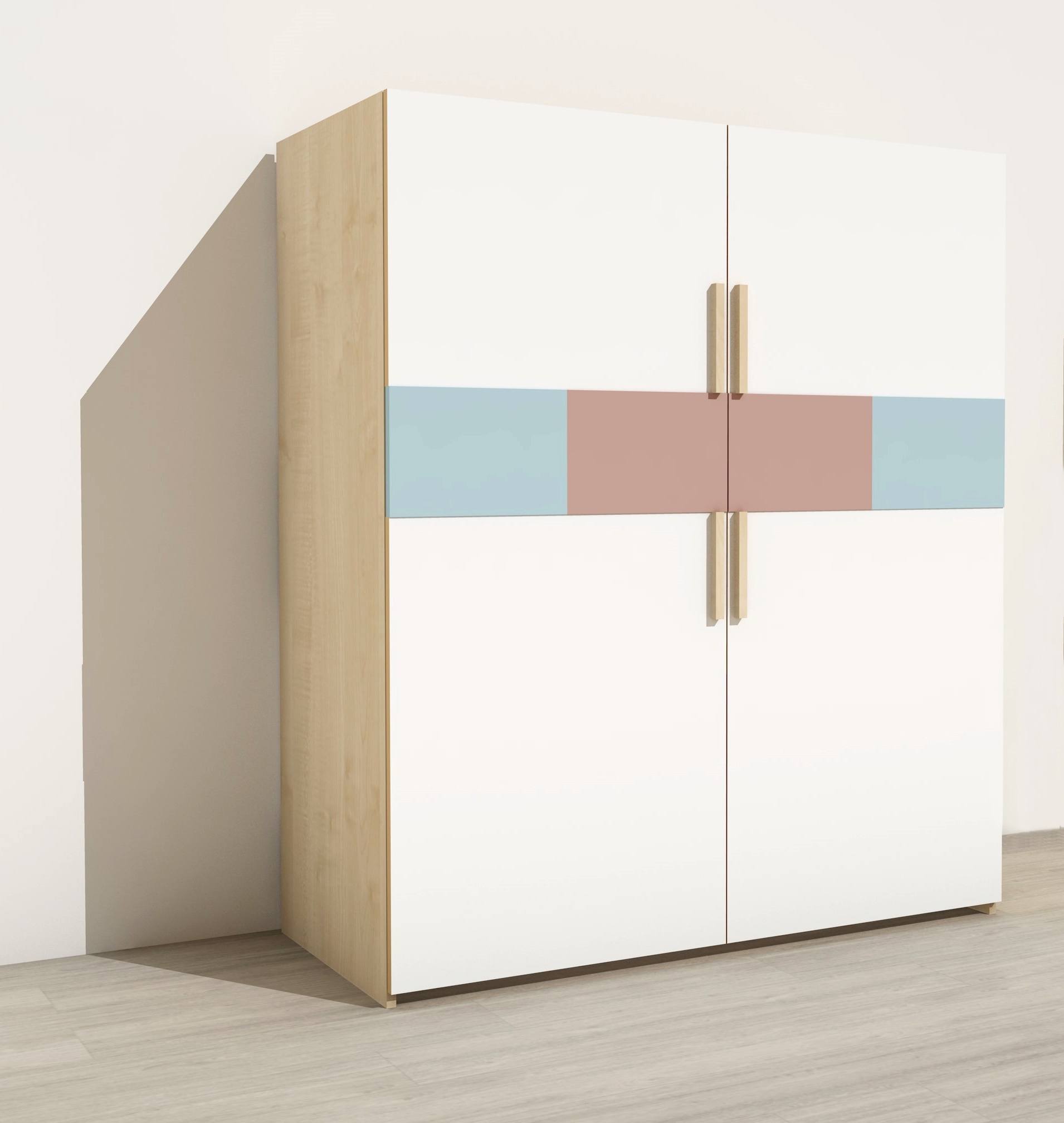 Az ágytároló bútor mérete: Szélessége: 154 cm Mélysége: 65 cm Magassága: 180 cm. Színe: Az alaptest kellemes juhar, az ajtók fehérek, betétek az égkék és mályva színek kombinációja. Lapraszerelt termék. Fa díszléc fogantyúval nyitható, lábazat nincs hogy az ultrakönnyű óvodai fektetőket kényelmesen belehessen gurítani.