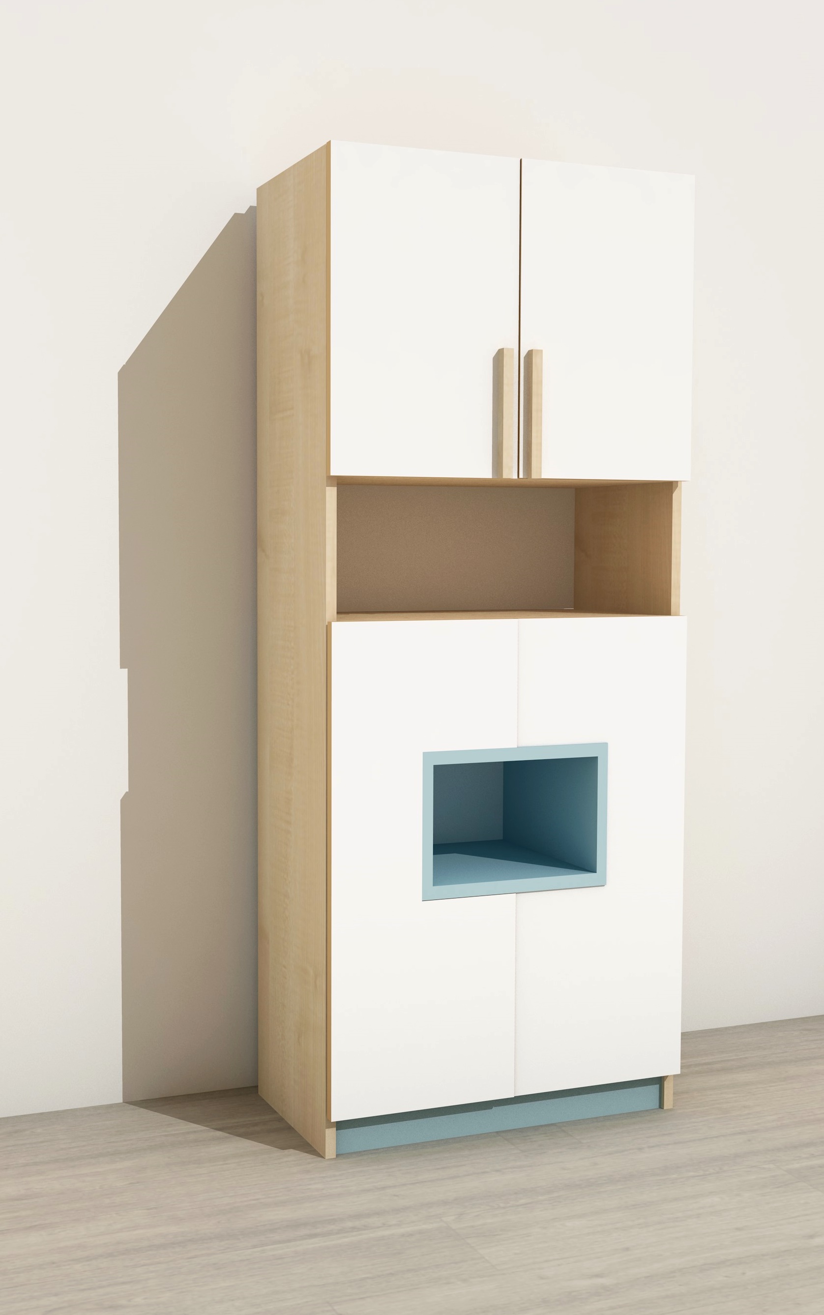 Ez a szépen kidolgozott, esztétikus szekrényelem igényes, díszfa léc fogantyúkkal készült, és a csoportszobák rendezett, barátságos megjelenését támogatja.A felső rész kétajtós szekrényelemében kényelmesen tárolhatók a mindennapi eszközök, alatta egy nyitott polc kapott helyet. Az alsó, kétajtós zárt részt egy kis nyitott dobozos rekesszel tettük izgalmasabbá, hogy a szekrény egyedi, játékos külsőt kapjon.A bútordarab sok praktikus tárolóhelyet, egyedi dizájnt és szolid stílust kínál, ami az Ádám bútorcsalád egyik fő erőssége. A szekrény normál (40 cm) mélységű, de a megszokottnál magasabb, 180 cm-es kialakításának köszönhetően kifejezetten dekoratív és látványos eleme lehet a csoportszobának.